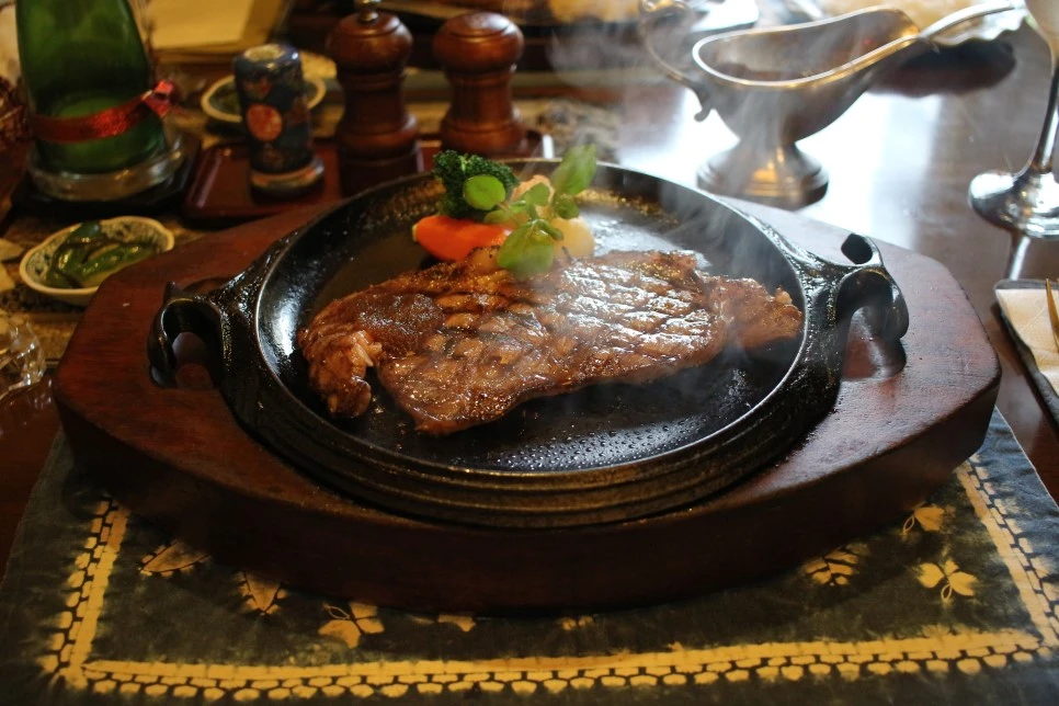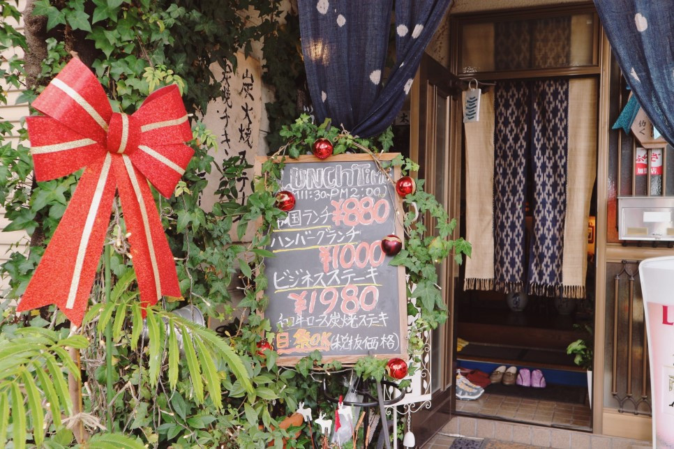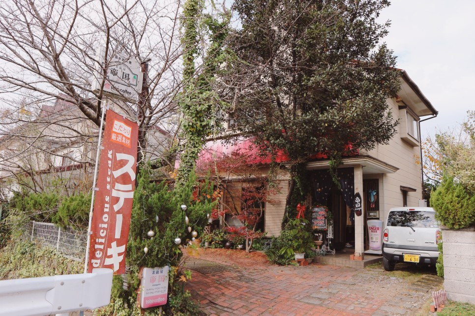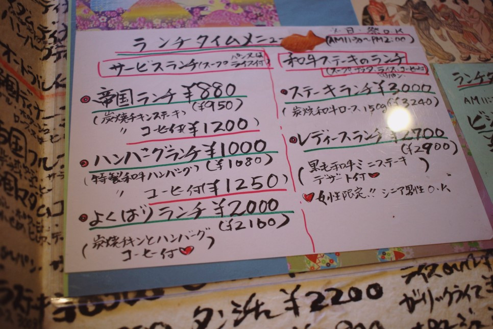 나무에 둘러쌓인 식당 외관이 신비한 느낌마저 주었다. '제국 이매진'이라는 가게 이름도 특이했고 '스테이크집(스테키야 / ステーキ屋)'을 비슷한 발음의 언어유희로 '멋진 집 (스테키야 / 素敵屋*)'이라고 표현하는 것도 재미있었다.
