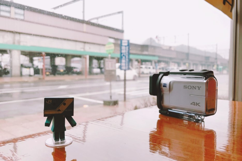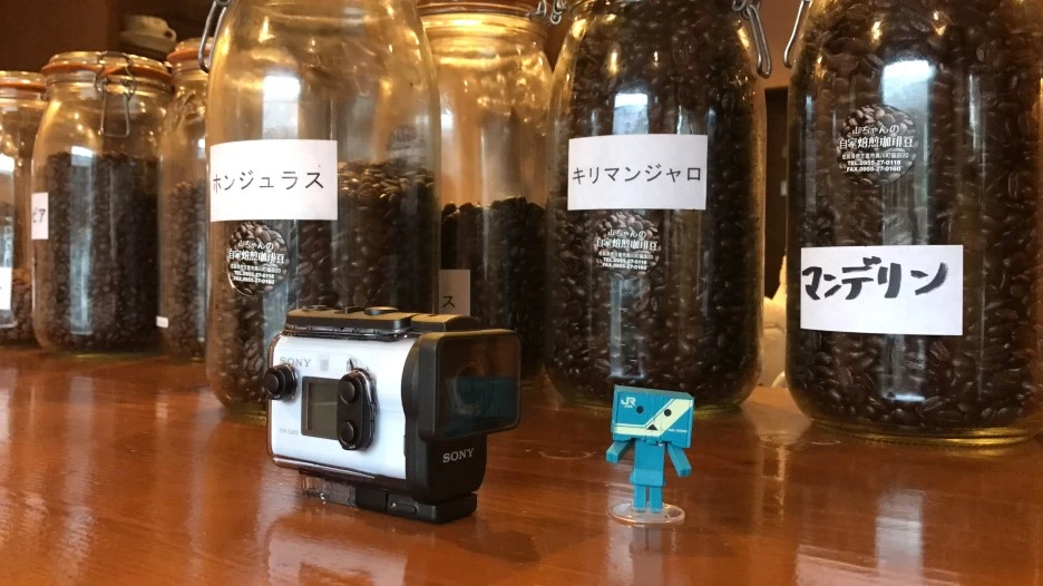 그리고는 다케오역 맞은편에 있는 '긴자(銀座)'라는 이름의 카페에 들러 커피 한 잔을 했다. 자가배전(自家焙煎)을 하는 곳이라 기대를 가지고 들어갔다. 각자 콩을 고르고 커피가 내려지기를기다리면서, 뽑기로 얻은 단보드와 소니 액션캠을 가지고 놀았다.