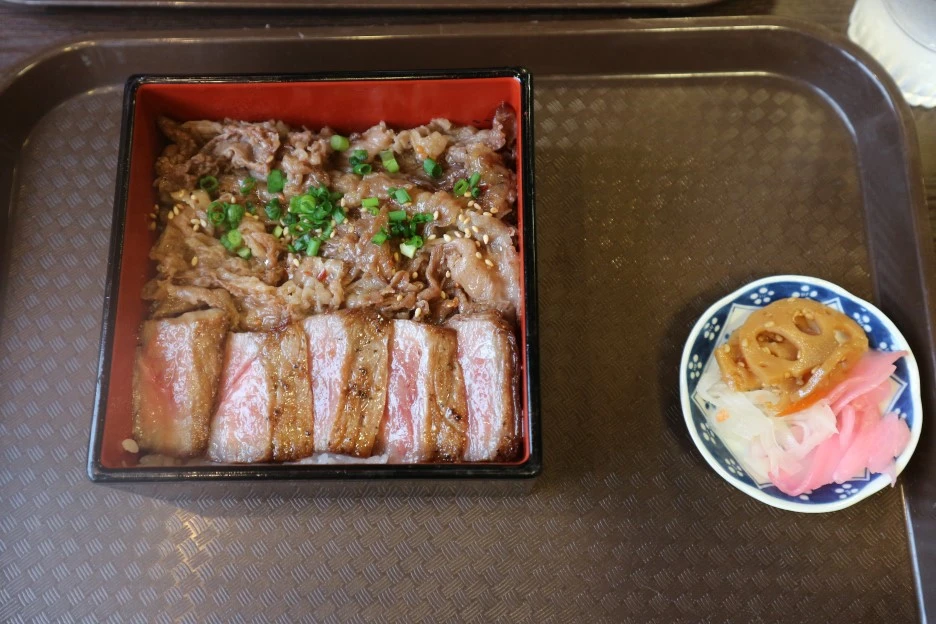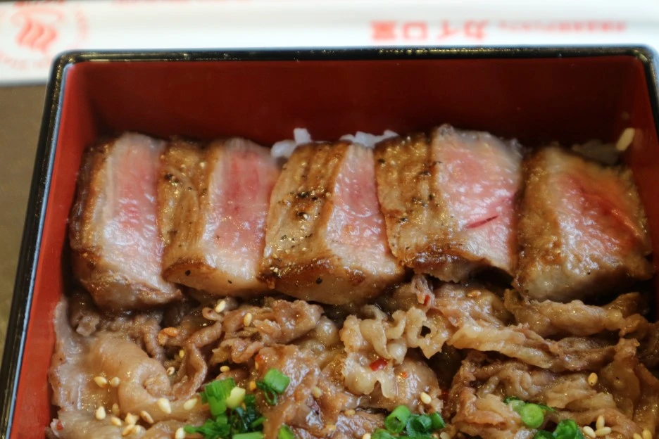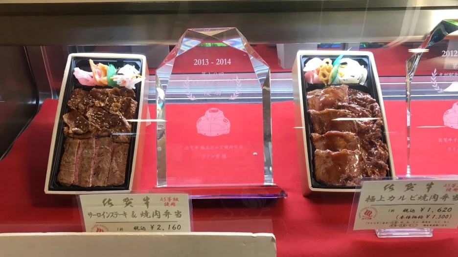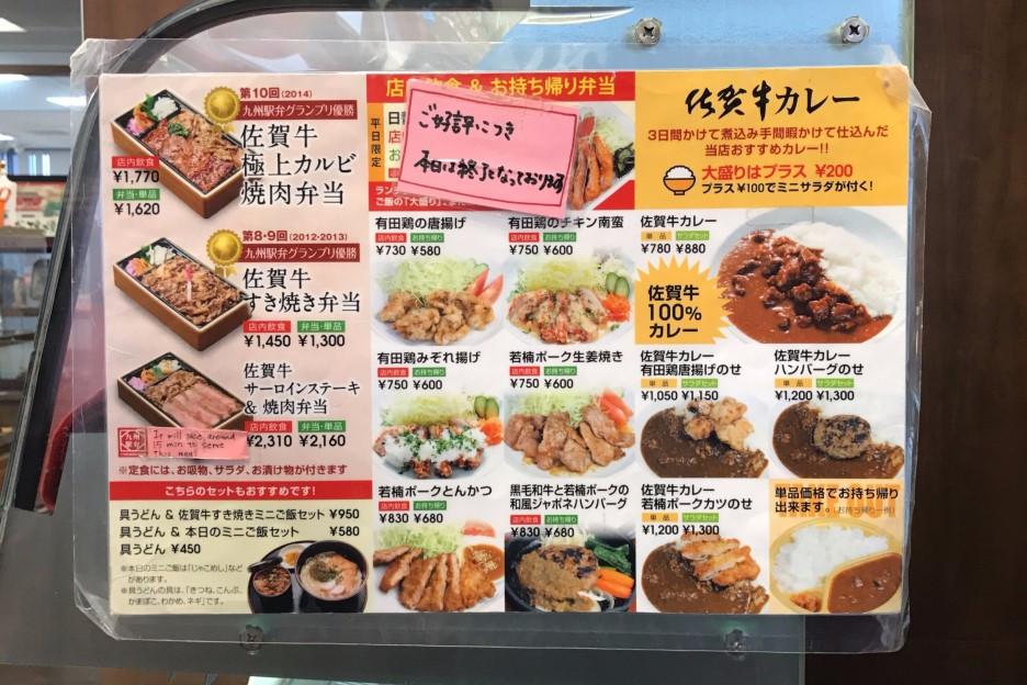 이 밖에도, 아리타 닭고기로 만든 가라아게, 치킨난반, 생강구이 그리고 사가규로 만든 카레 등도 팔고 있는데, 우리와 같은 관광객이 아닌 현지인들은 저런 요리도 많이 먹는 것을 목격했다. 먹기 전에 알았다면, 저것 중에서도 하나 시켜보았을텐데 아쉽다. 우리 부부는 내가 좋아하는 서로인 스테이크 벤또와 갈비 벤또를 주문했다.