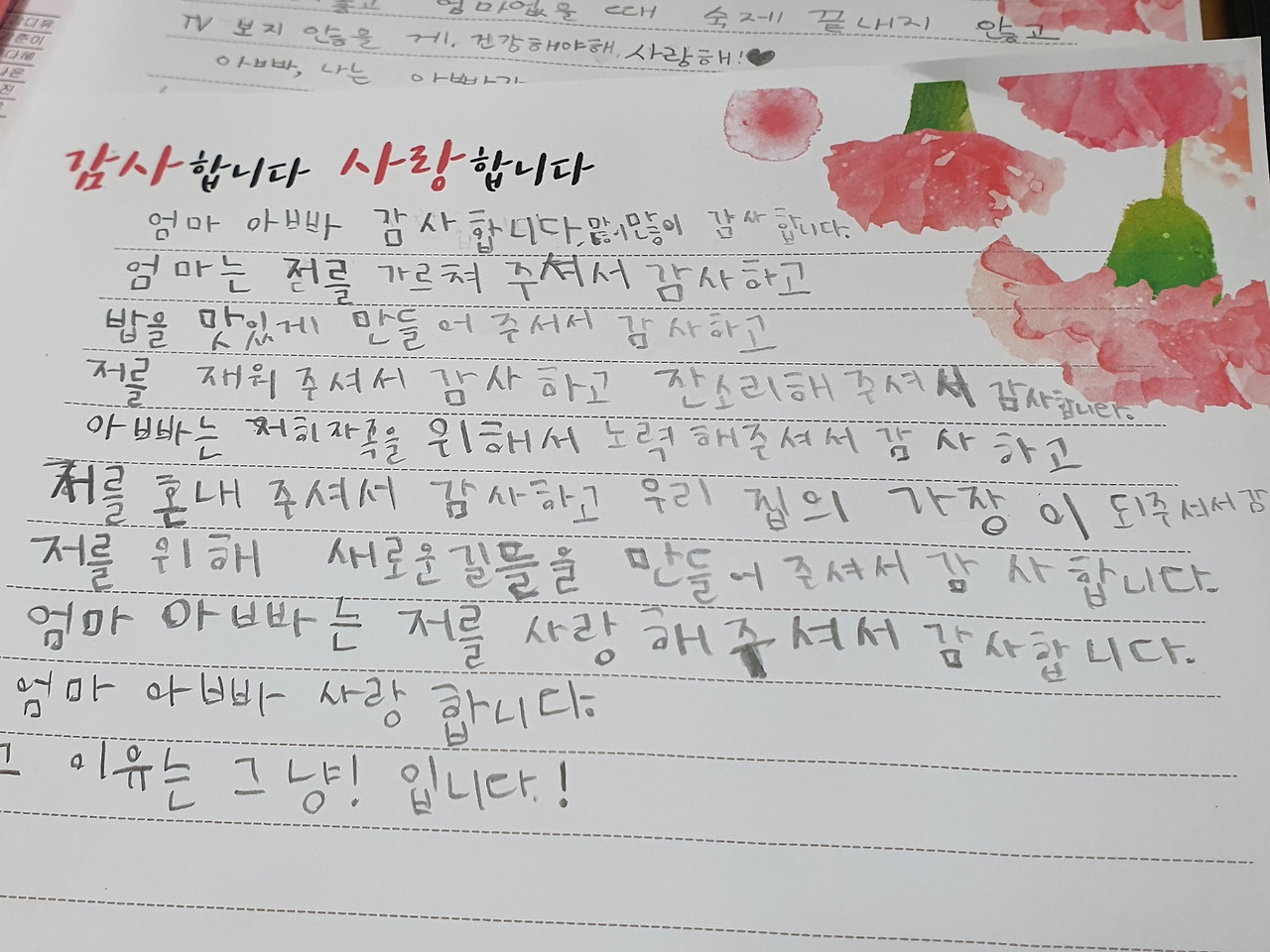 엄마 아빠는 저를 사랑해 주셔서 감사합니다.