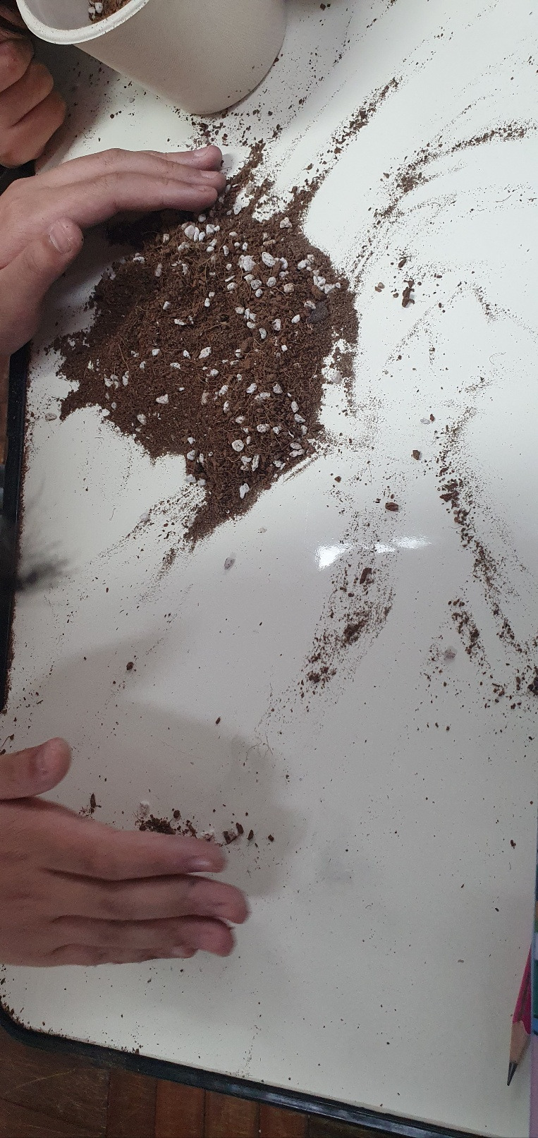아이 둘은 한 시간 내내 뒤져서 드디어 씨앗으로 '추정되는' 몇 알을 추려내고는 심었다.