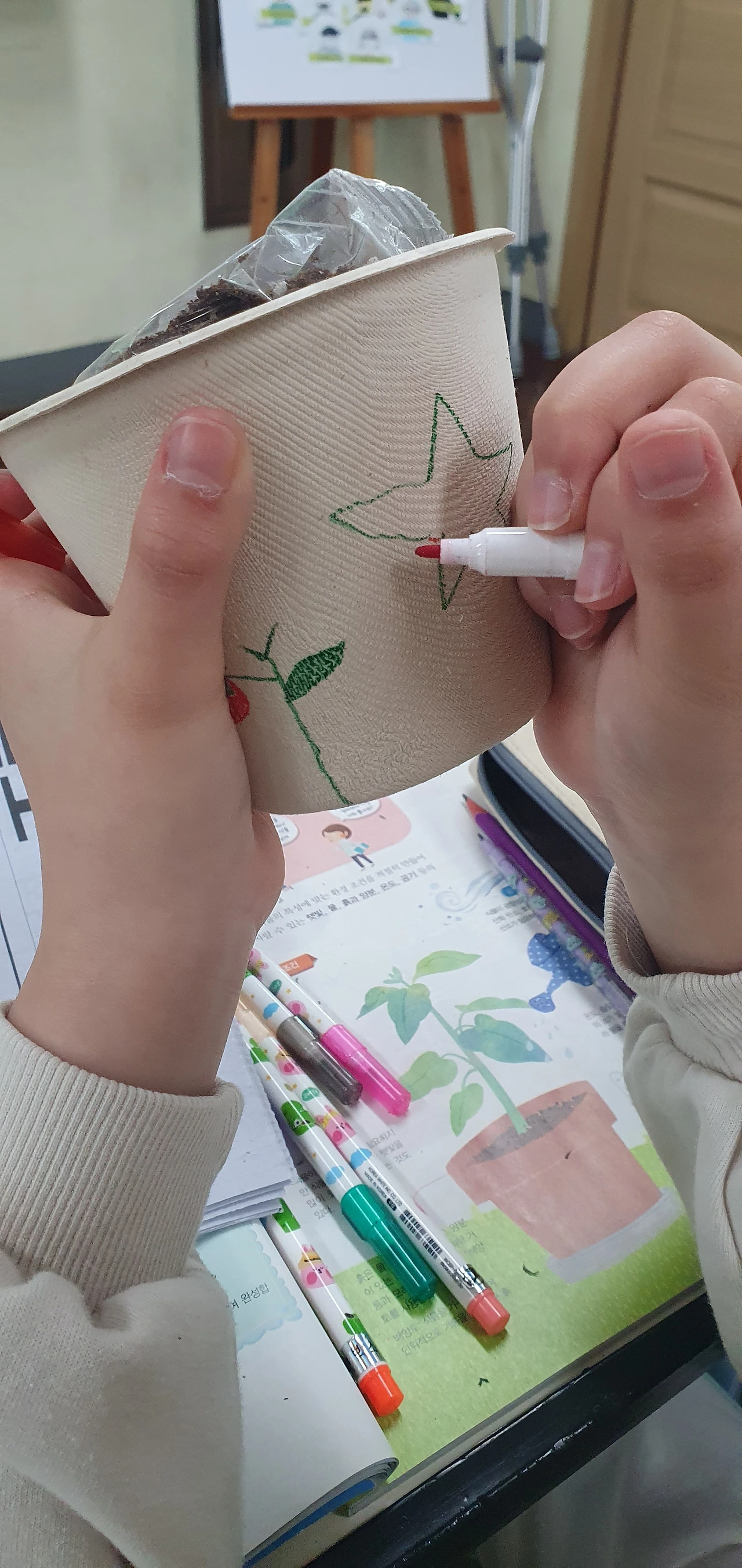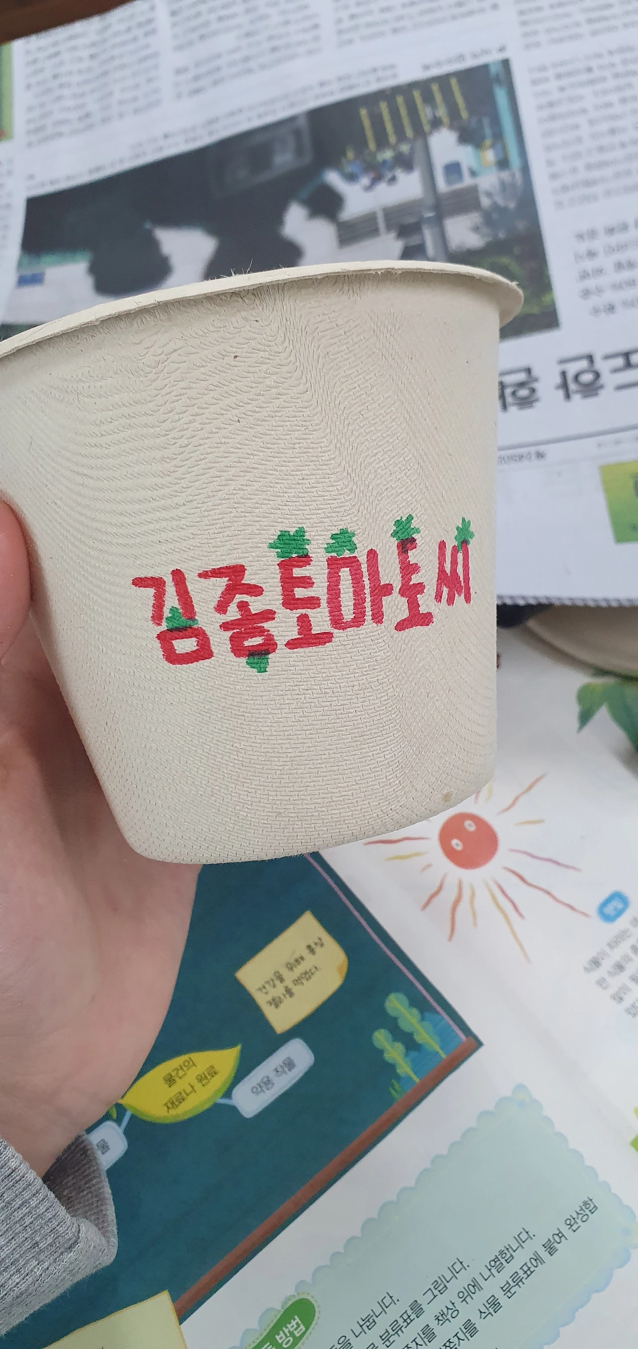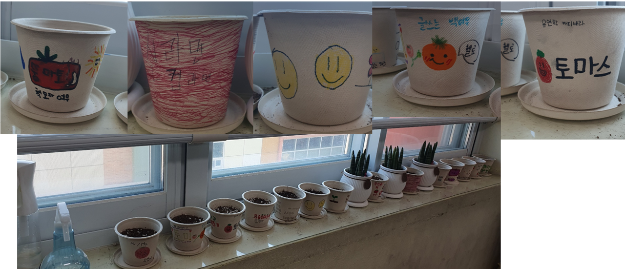 먼저 자신의 방울토마토 이름을 정하고 화분에 적고 나서 흙을 넣고 씨를 심기로 했다.