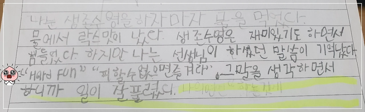 지난 5월에 생존수영 수업을 다녀온 한 아이의 글 속에서 '하드뻔'을 발견할 수 있었다.