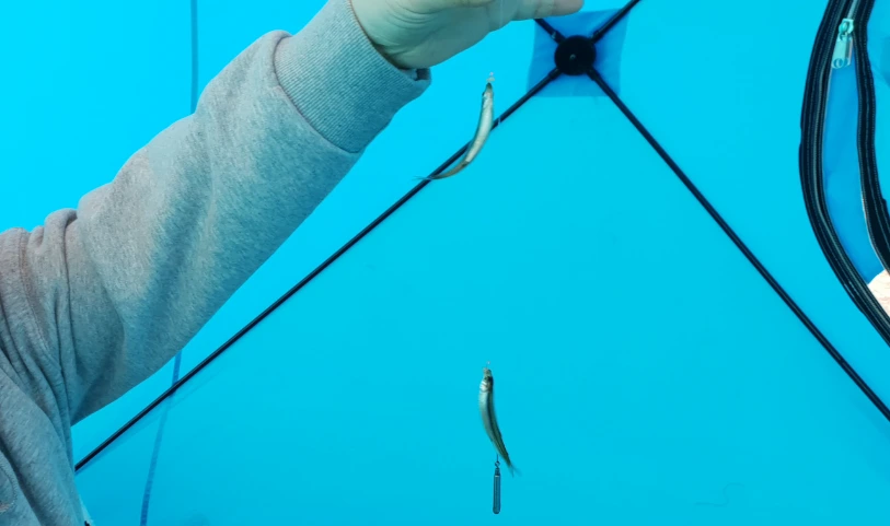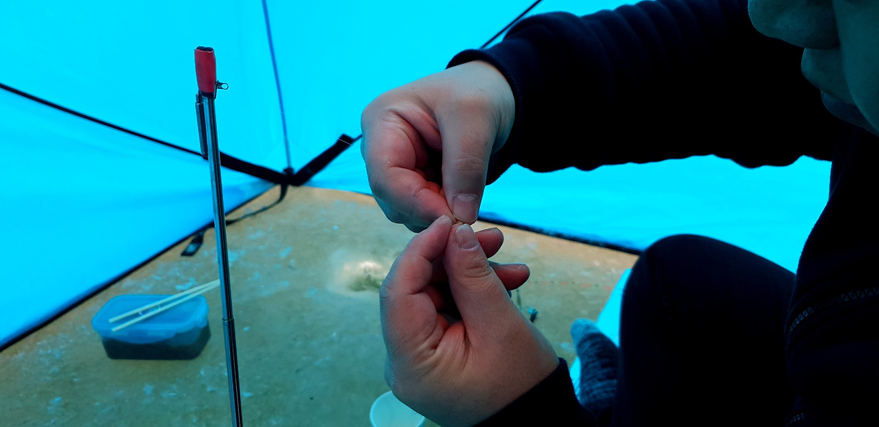 낚싯바늘에 빙어를 유인할 미끼를 끼우고