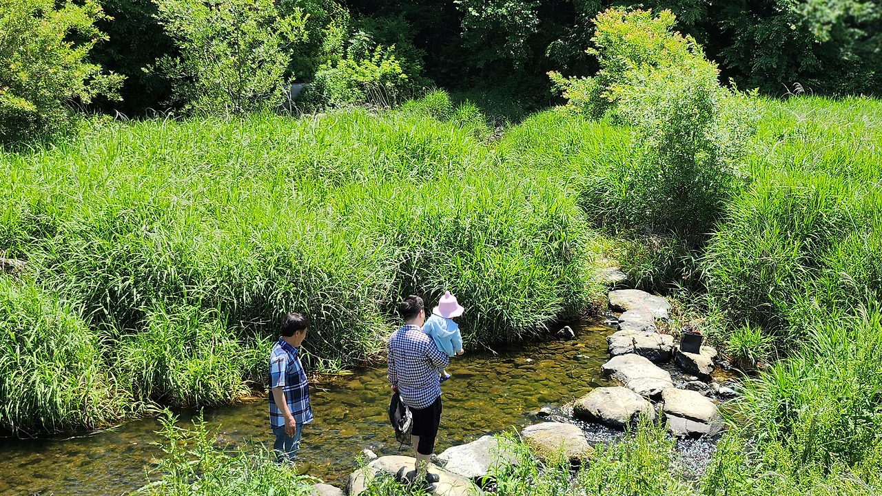 그렇게 물고기를 잡아댔으면서도 물고기를 손으로 잡는 것을 극도로 무서워하는 나와 달리, 아들은 빙어도 손에 바로 잡고 좋아하는 편이었다. 당시에도 많이 놀랐는데, 이번에 아들과 우연히 해본 피라미 낚시는 무척이나 즐겁고 재미있는 시간이었다. 자기가 하고 싶은 걸 못해 생떼를 피우다가 물고기 보러 가잔 말에 따라나선 아들. 아들과 같이 낚시채비를 해서 시댁 근처 물가로 갔는데, 아들은 초록초록한 풍경이 마음에 들었는지 활짝 웃어 보였다. 아빠 따라서 먼저 내려간 아들은 돌 위에 가만히 서서 아빠를 기다렸다.