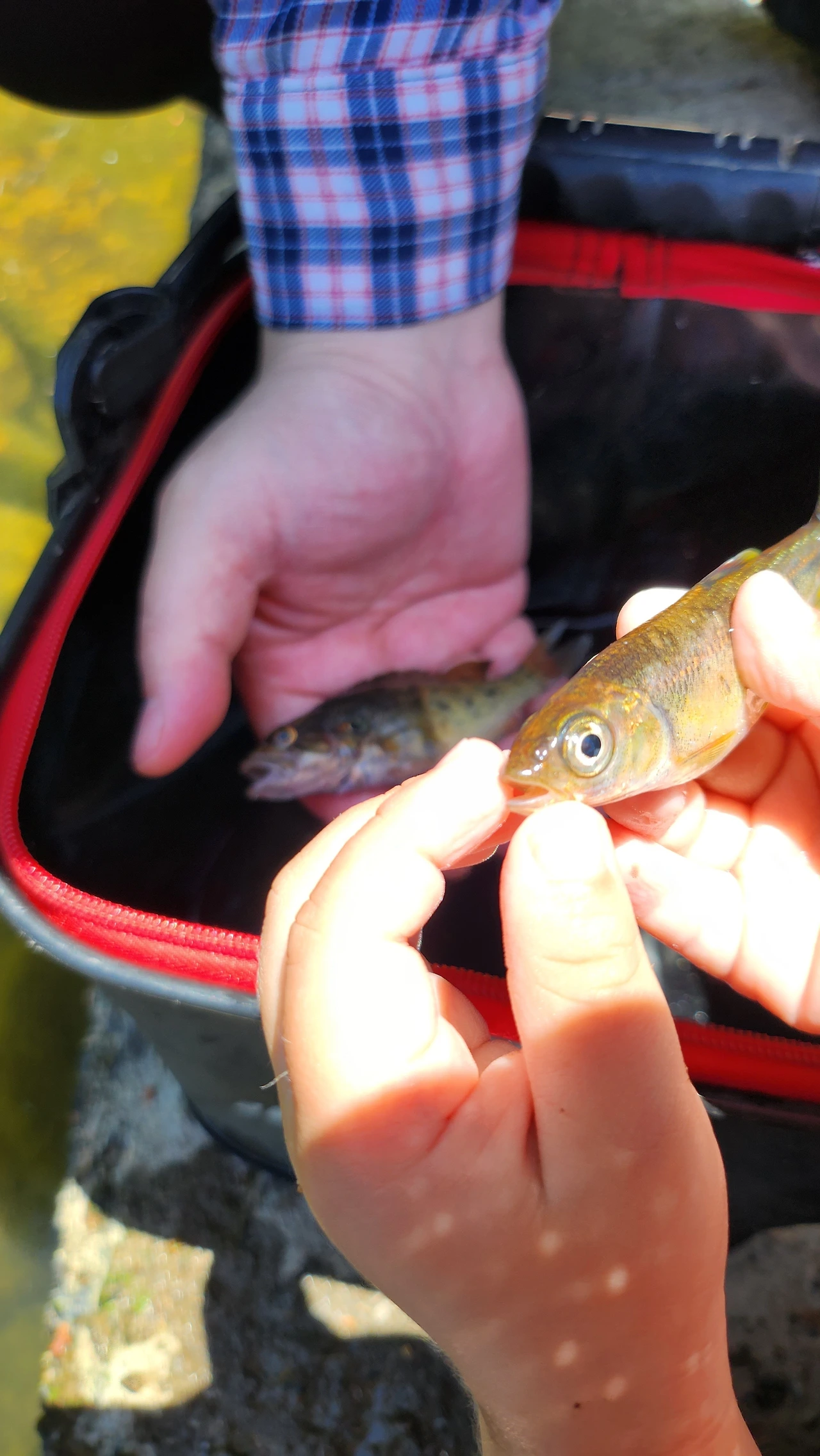 남편은 미리 준비해 둔 피라미 채비를 정리해서 아이와 함께 물가로 던졌다. 작년 가을쯤엔 망둥어 낚시를 갔는데 그땐 더 어렸고, 낚싯대도 길었고 여러 요건이 좋지 못해 잡을 수 없었는데 이번엔 좀 달랐다. 남편과 나, 아이까지 셋이서만 있고 물도 적당히 흘러가는, 시골 냇가지만 아이의 첫 낚시를 하기엔 딱 좋은 곳이었다. 아빠랑 낚싯대를 손에 꼭 쥐고 물고기가 잡히길 기다리던 찰나! 아들은 피라미를 낚았다. 그것도 두 마리씩이나!