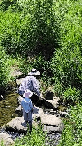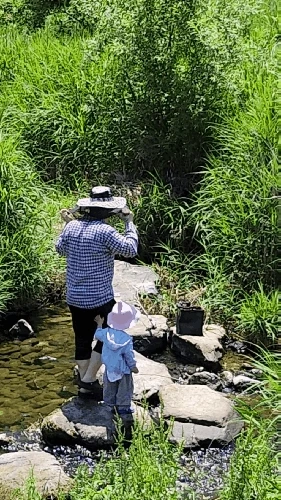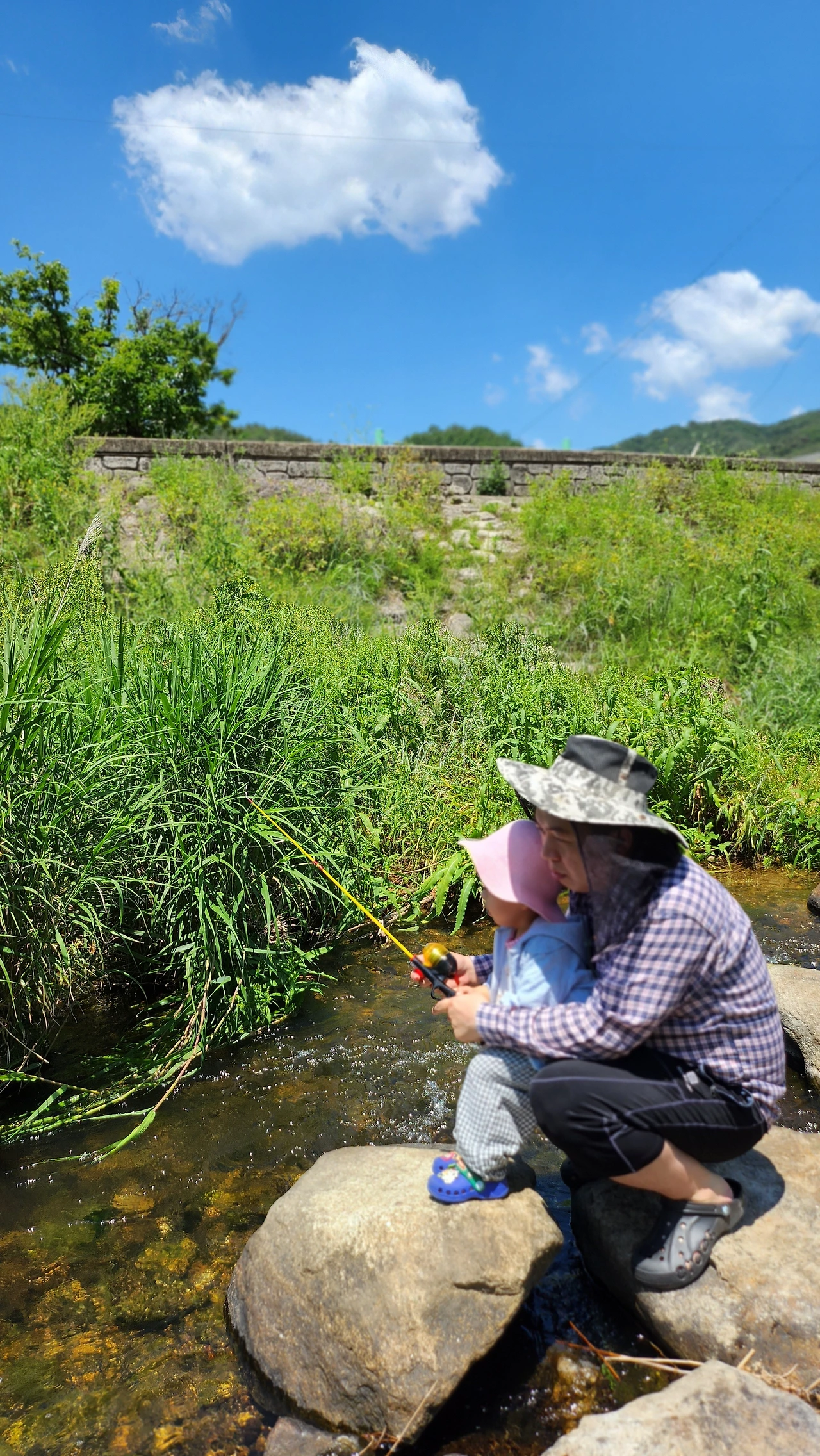 물론 육아가 늘 해피엔딩일 수는 없다. 이날 피라미 3마리를 잡은 아들은 냇가에서 나가기 싫어했다. 그리고 자기가 직접 잡은 피라미 3마리를 너무너무 예뻐했다. (너무 예뻐해서... 다시 풀어주는데 떼어내기 곤란했음) 이런 뒷이야기가 있긴 하지만, 결론적으로 보면 남편과 나의 로망이랄까, 아니 같이 꿈꾸던 버킷리스트 중 하나인 '가족낚시'는 한걸음 이룬 셈이다. 아이에게 피라미 낚시를 할 수 있게 도와준 남편도 고생했고, 뜨거운 날씨에 엄마가 잔뜩 입혀놓은 모자며 잠바 입고 낚시한 아들도 장하고, 이 둘의 그림이 너무 기특하고 예뻐서 그 좋아하던 낚시를 포기하고 촬영하느라 바빴던 나도 모두! 모두에게 이날은 잊지 못할 아들의 첫 낚시.