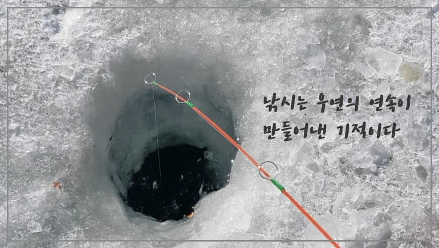 낚시는 항상 계획한 대로 잡히지 않는다. 어떤 어종을 낚을지 생각하고 채비를 해서 가지만 늘 의외의 것들이 잡히거나 잡히지 않거나 하는 우연의 연속이 모인다. 빙어를 잡으러 갔다가 피라미를 잡는다랄지, 지나가던 이름 모를 작은 물고기를 낚는다랄지. 이렇게 계속 낚시를 하면서 생기는 작고 소소한 우연들이 모여 마침내 원하던 것을 낚게 된다.