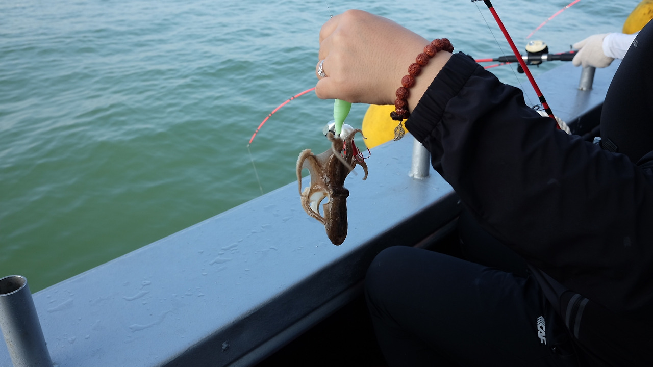 우리의 주꾸미낚시는 마치 '자유시간 30분 드릴게요~ 요기조기 다녀오시고 돌아오시면 됩니다'라고 안내하는 패키지여행 같았다. 우리에게 주어지는 낚시의 시간은 선장이 불어주는 나팔소리에 맞춰서 시작되었고, 마무리되었다. 응?! 이건 뭐지?! 이건 마치 기계적으로 낚싯대를 들어 올리고 내리는 반복의 과정을 삑 소리에 맞춰서 계속하는 운동 같았다. 점점 주꾸미 낚싯대를 들어 올리는 게 버거울 무렵, 옆에 있던 남편이 갑자기 주꾸미를 들어 올렸다.