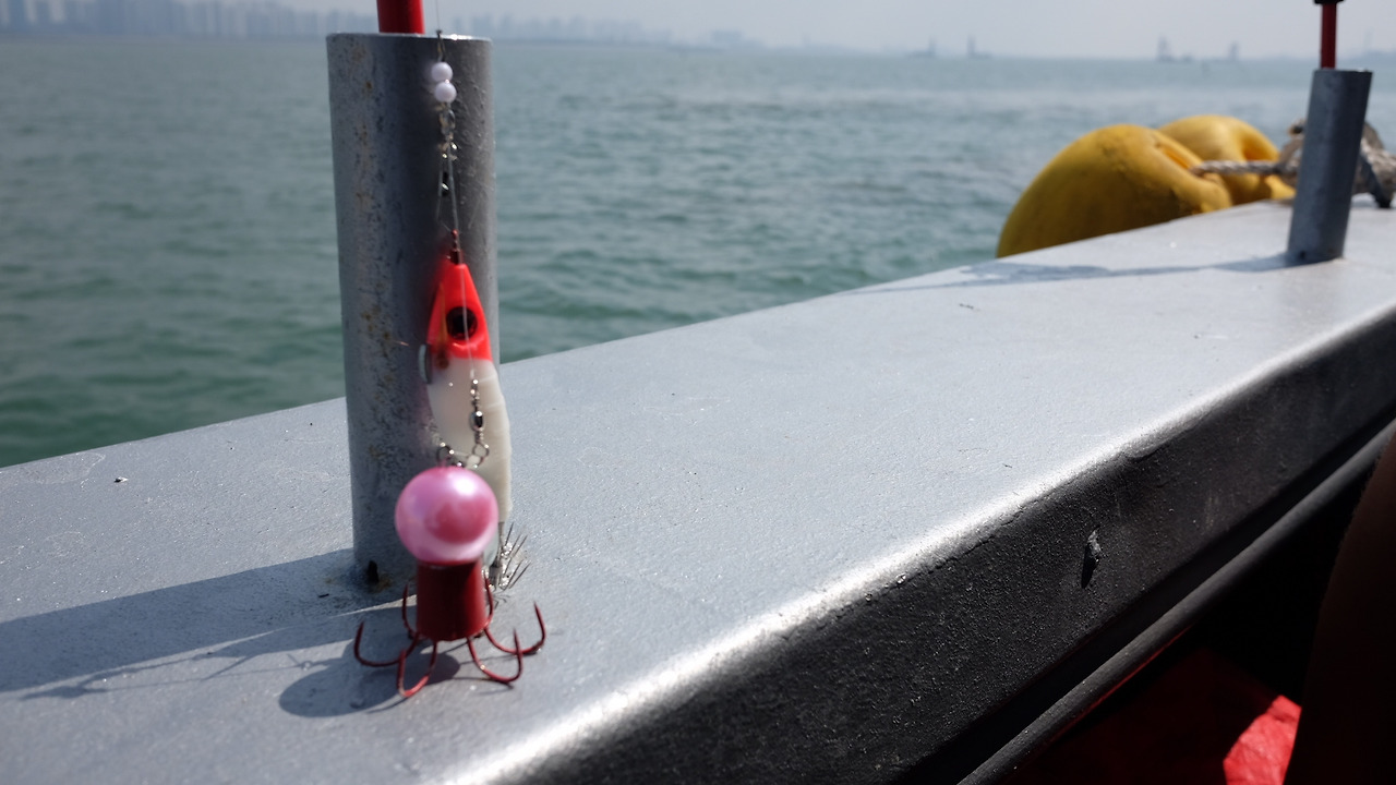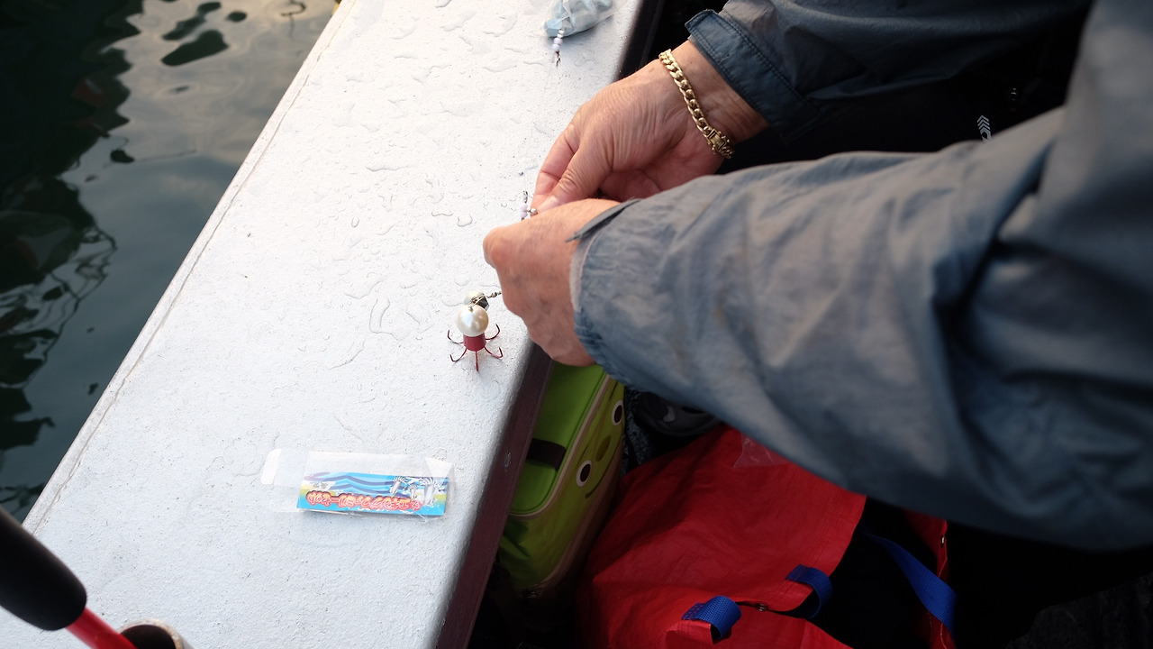 부쩍 차가워진 새벽 공기는 졸린 눈을 뜨게 했고, 어느덧 연안부두에 도착! 이제 예약 확인만 하면 배에 오를 수 있으니, 1시간도 채 못 잔 것도 잊어버리고 배 위에 올랐다. 달달한 간식이 들어있는 묵직한 짐가방도 함께. 배 위로 이미 올라탄 사람들 틈바구니에 적당한 자리를 잡고 배 주인인 선장에게 채비를 준비하는 요령을 배웠다. 주꾸미 낚시에서 중요한 것은 에기라고 불리는 물고기 모양으로 되어있는 낚싯바늘과 에자라고 불리는 야광 알을 품은 낚싯바늘, 여기에 추까지 달아야 한다고 했다. 낚싯바늘이 무거워야 바닥까지 쉽고 빠르게 내려갈 수 있으니까.
