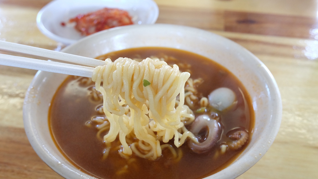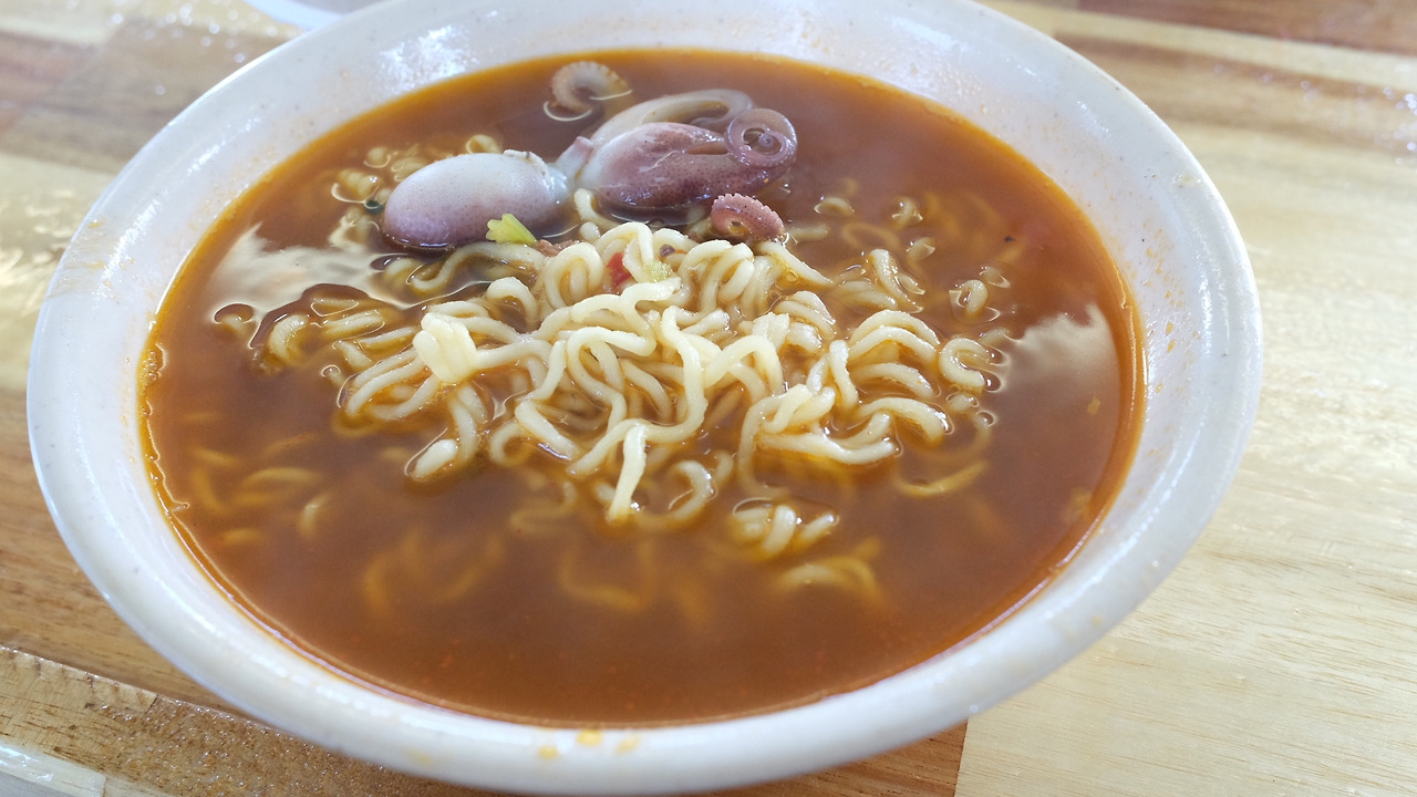 화가 진정된 나를 조용히 배 안에 있는 매점으로 데려간 남편은 주꾸미 라면을 주문했다. 매점 이모는 직접 잡은 거 작은 걸로 두 마리만 줘봐요~라고 했고, 남편은 자리로 얼른 돌아가 싱싱하지만 크기가 작은 주꾸미를 가져왔다. 얼큰한 라면에 퐁당 들어간 주꾸미는 먹음직스럽게 익었고, 주꾸미와 함께 끓여진 라면은 산해진미보다 맛있고 깊은 국물의 맛을 냈다. 먹는 내내 감탄을 하던 나는 웃기 시작했고, 남편은 그제야 가슴을 쓸어 넘기며 같이 호로록 소리를 내며 깨끗하게 비워냈다.