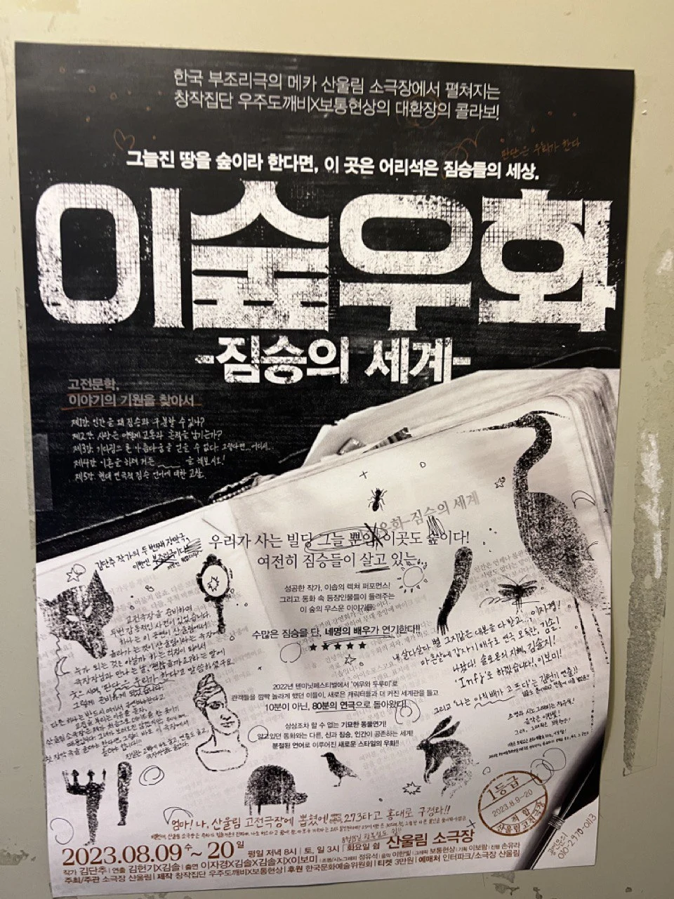 ‘무엇인가 진지하고 절실한 것을 말하려고 했다’는 것을 직감하고서 오래된 소극장으로 달려갔습니다. 무거운 마음으로 객석을 떠나면서도 내가 제목을 오독했다는 걸 몰랐습니다. 직감이란 한 순간 오독의 나락으로 떨어질 가능성이 있음을 깨달은 것은 한참 지나서였습니다. 밖으로 나가는 계단 벽에 붙어있는 포스터를 보고도 나는 속으로 말했으니까요. 이솝우화라고? 이솝우화라며!