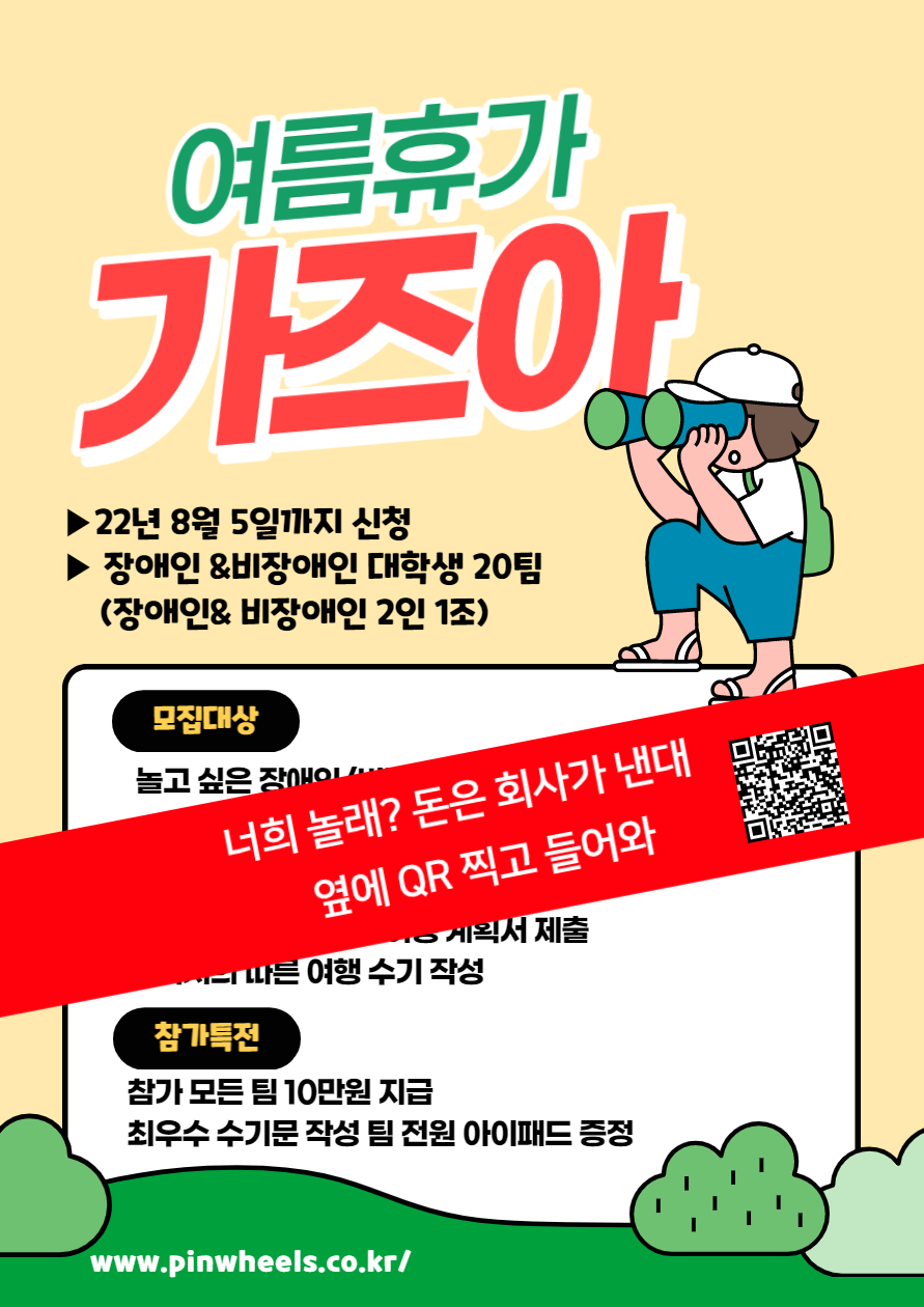 [여름휴가 가즈아] : 핀휠의 비정기 프로그램으로, 장애인과 비장애인 대학생이 2인 1팀을 구성하여 여행을 떠납니다. 잘 놀고 오면 1팀 당 10만원을 줍니다. 제일 잘 놀고 온 팀은 아이패드까지 줍니다. (사장님이 미쳤어요)