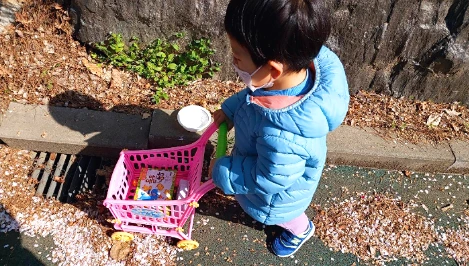 겁 많은 꼬맹이와의 오늘 산책은 성공이네. 막대 사탕 하나의 위력이라니.