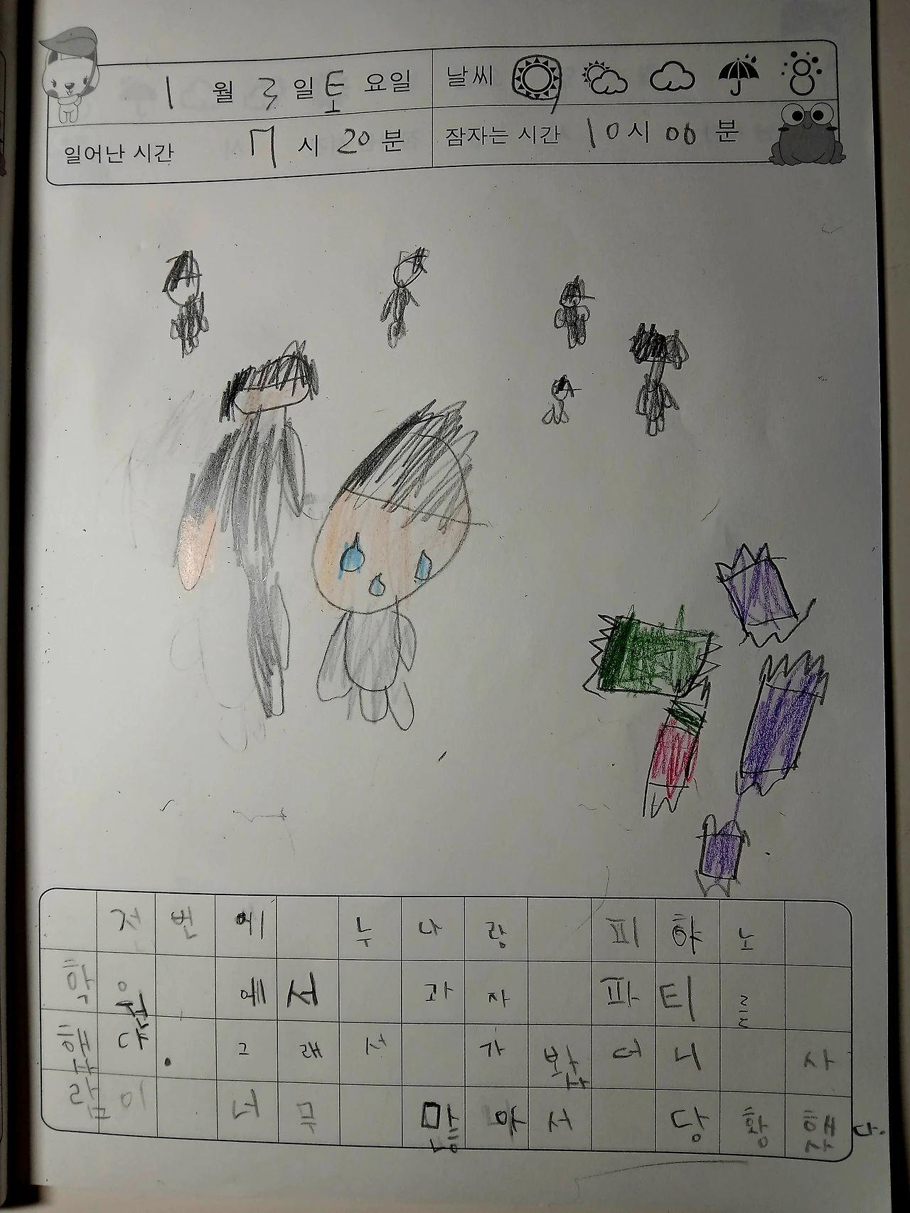 안 그래도 그림일기가 시작되고 한 주에 한 번 선생님에게 그림일기를 제출하는데 그림을 대충 그린다는 친구의 말이 신경 쓰이는지 그림일기를 시작할 때마다 엄마 못 그리겠어, 어떻게 그려 말하며 곤란해하는 중이었다. 배움의 필요성을 느껴 용기를 끌어내 미술 학원에 간 첫날은 너무 힘들다며 울상이더니 세 번쯤 출석하니 재미있다며 웃는 얼굴이다.