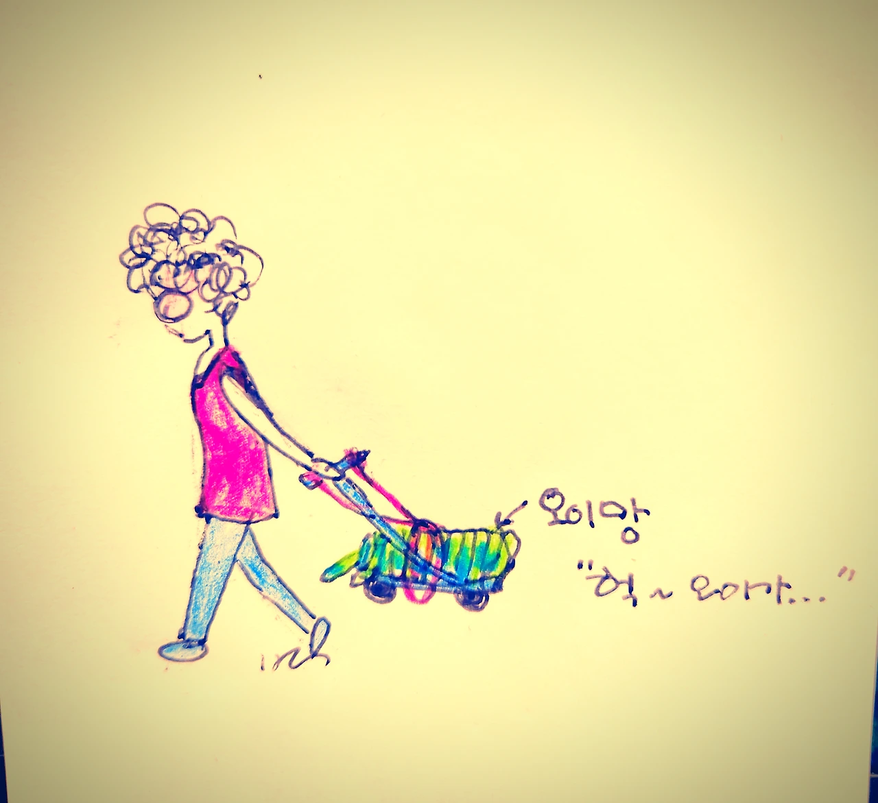 뒤따라오던 초등생엄마가 바닥에 끌려 흘러내리는 오이를 가리키며 일러 준다.