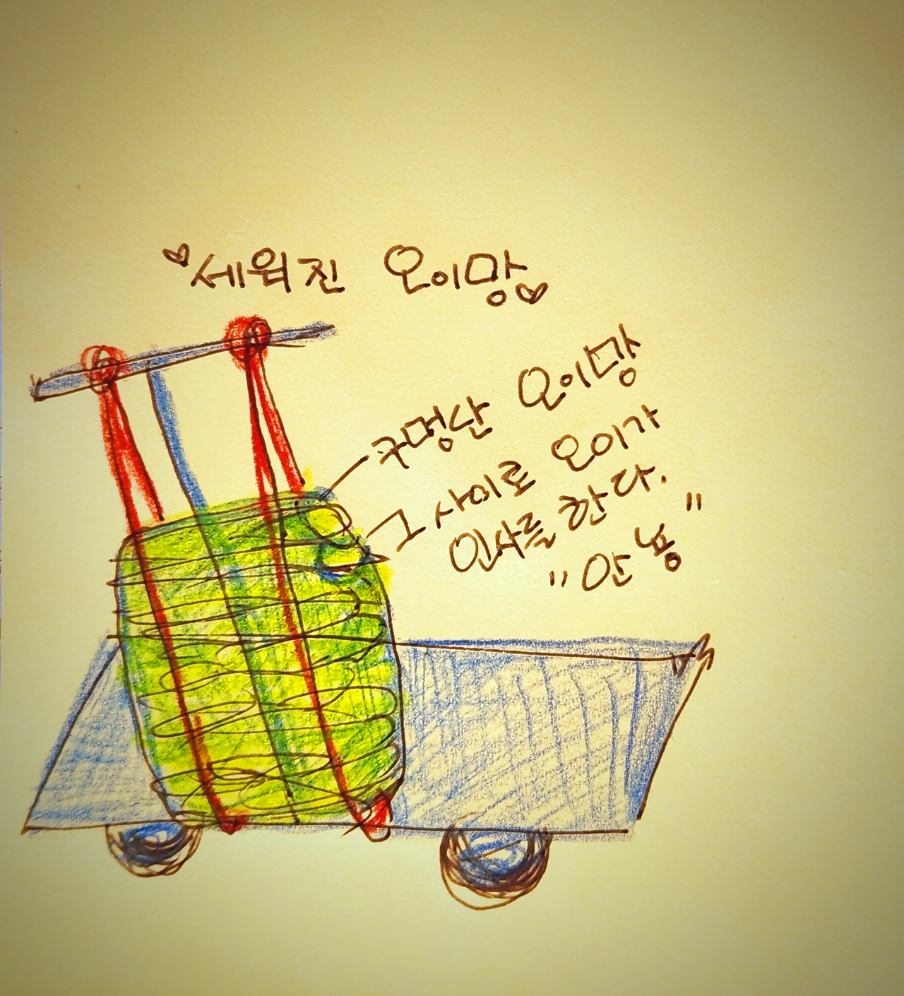 '이봐요. 또 떨어지겠어. 잠깐 쉬어서 잘 정리해서 싣고 가요'라고 소리치신다.