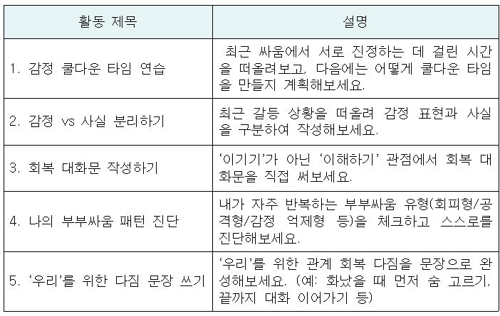 아래는 싸움의 감정 조절, 사실 기반 대화, 회복 전략에 중점을 두고 구성한 <<부부싸움은 필요해? 그렇다면 합리적으로 잘 마무리하는 방법은?>> 활동지입니다. 설명을 잘 읽으면서 감정 쿨다운 타임 연습하기, 감정과 사실 분리하기, 회복 대화문 적성하기, 자신의 부부싸움 돌아보기, 우리를 위한 관계회복 다짐을 문장으로 완성해 보세요.