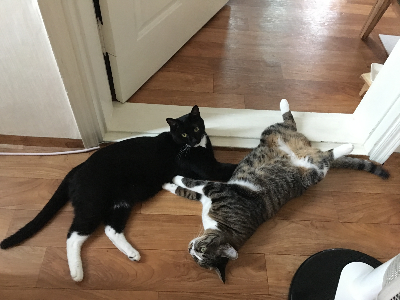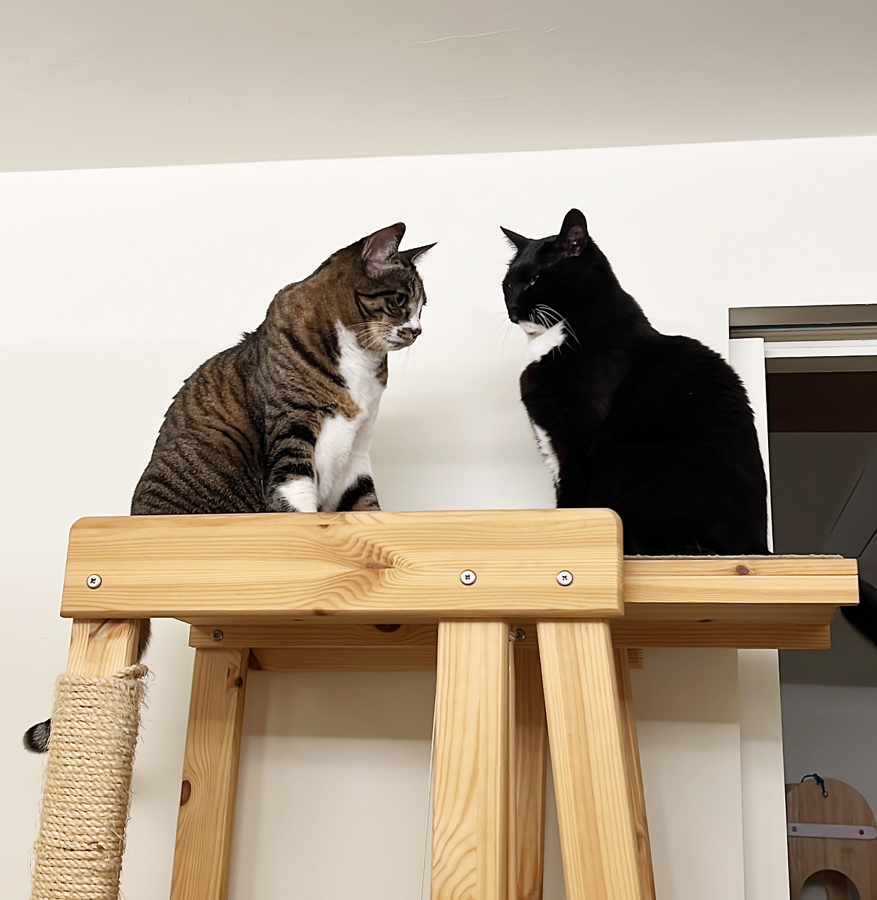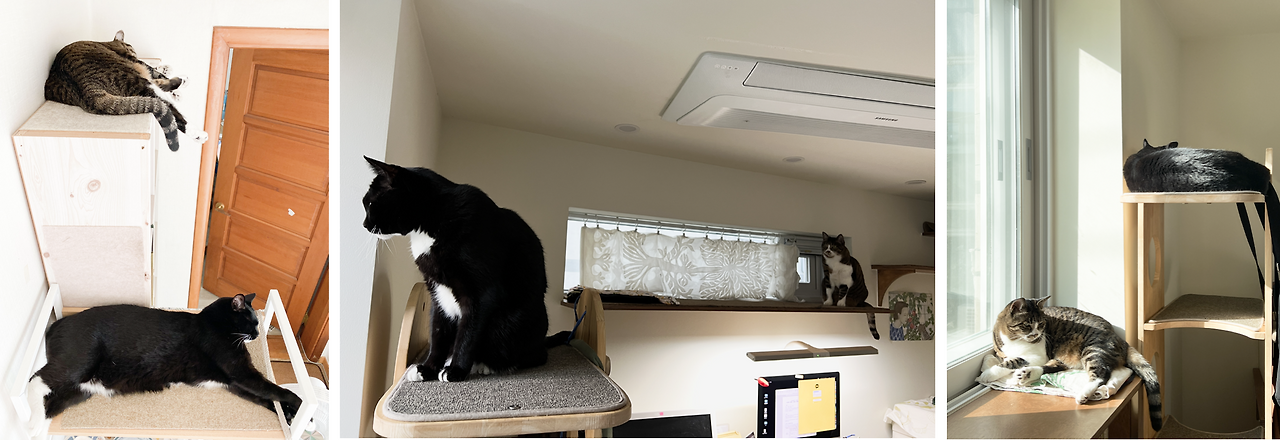 집으로 데리고 올 때에 캣타워를 처음 사고 여러 가지 물품을 구입해서 드디어 아이들을 위한 공간으로 온 집을 배치했다. 고양이들은 청소년기까지는 같이 엉켜서 자고 붙어있지만 성묘가 되면 자기 공간을 분리한다. 예를 들면 오늘은 창가 캣타워가 아띠의 자리로 정해서 누워있다면 루카는 조금 떨어진 책상 위 선반에 눕는다. 가끔 내 옆의 스크래쳐를 쟁탈하기 위해 싸우기도 하면서 먼저 선점해 있으면 다른 영역을 찾는다. 각자 선호하는 영역이 있어서 주로 있는 자리가 있지만 바뀌는 날도 종종 있다. 이렇게 성묘들은 매일 자기 영역을 정하고 매 순간 스스로 안전하게 있을 자리를 찾는다.
