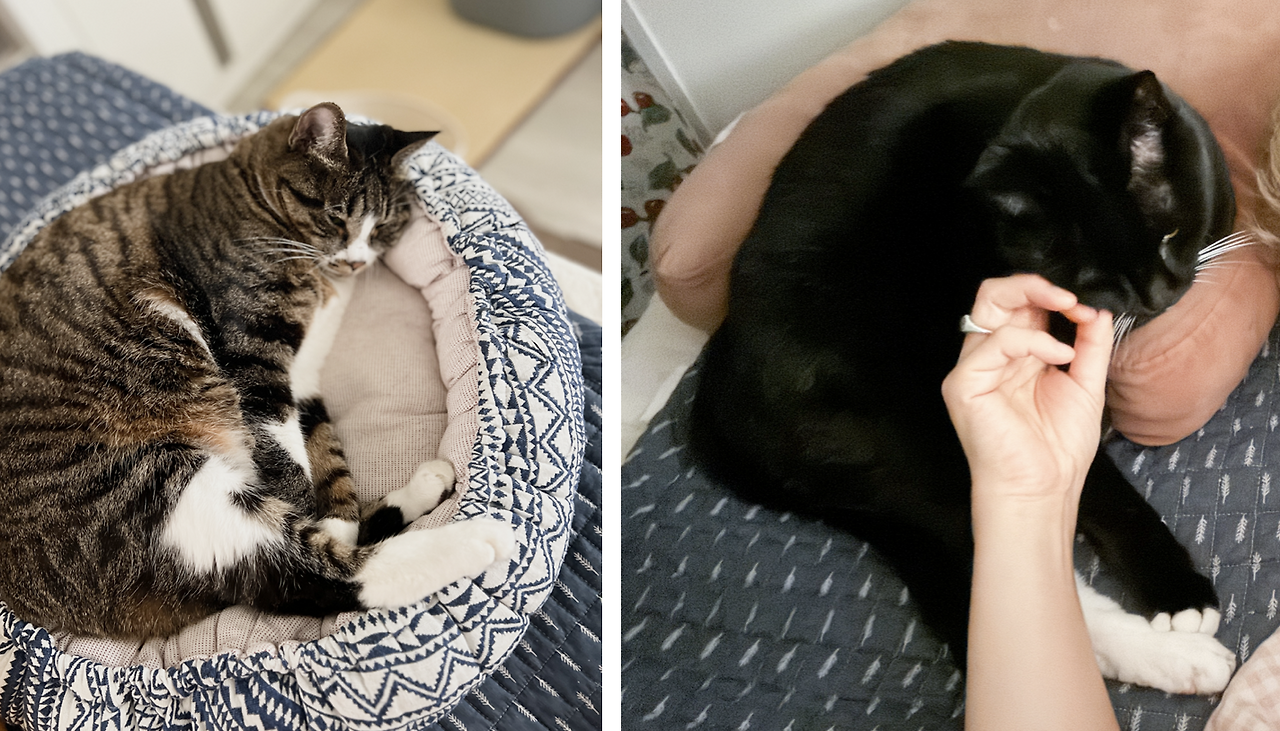 우리 집 침대는 그냥 보면 어수선하다. 그러나 고양이의 눈으로 보면 영역이 6개 이상인 훌륭한 쉼터이다. 내 이불, 가장자리의 둥근 방석, 작은 이불 두 개, 나무늘보 인형, 베개. 내 이불과 베개만 내 것이고 나머지는 아이들을 위해 영역을 만들어두었다. 바닥에 A4용지가 있으면 그 위에 앉는 것이 고양이어서 잘 때 맘 편히 너의 영역을 정해서 자라고 정리 잘 된 깔끔한 잠자리를 포기하였다.
