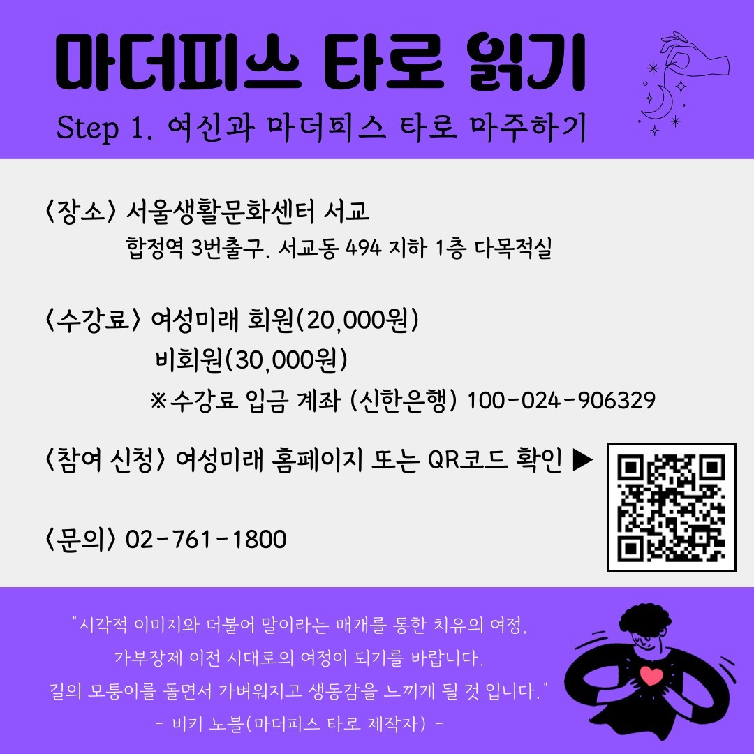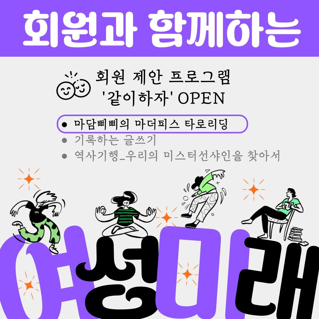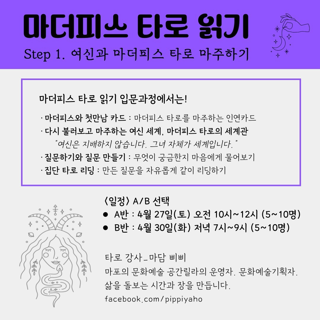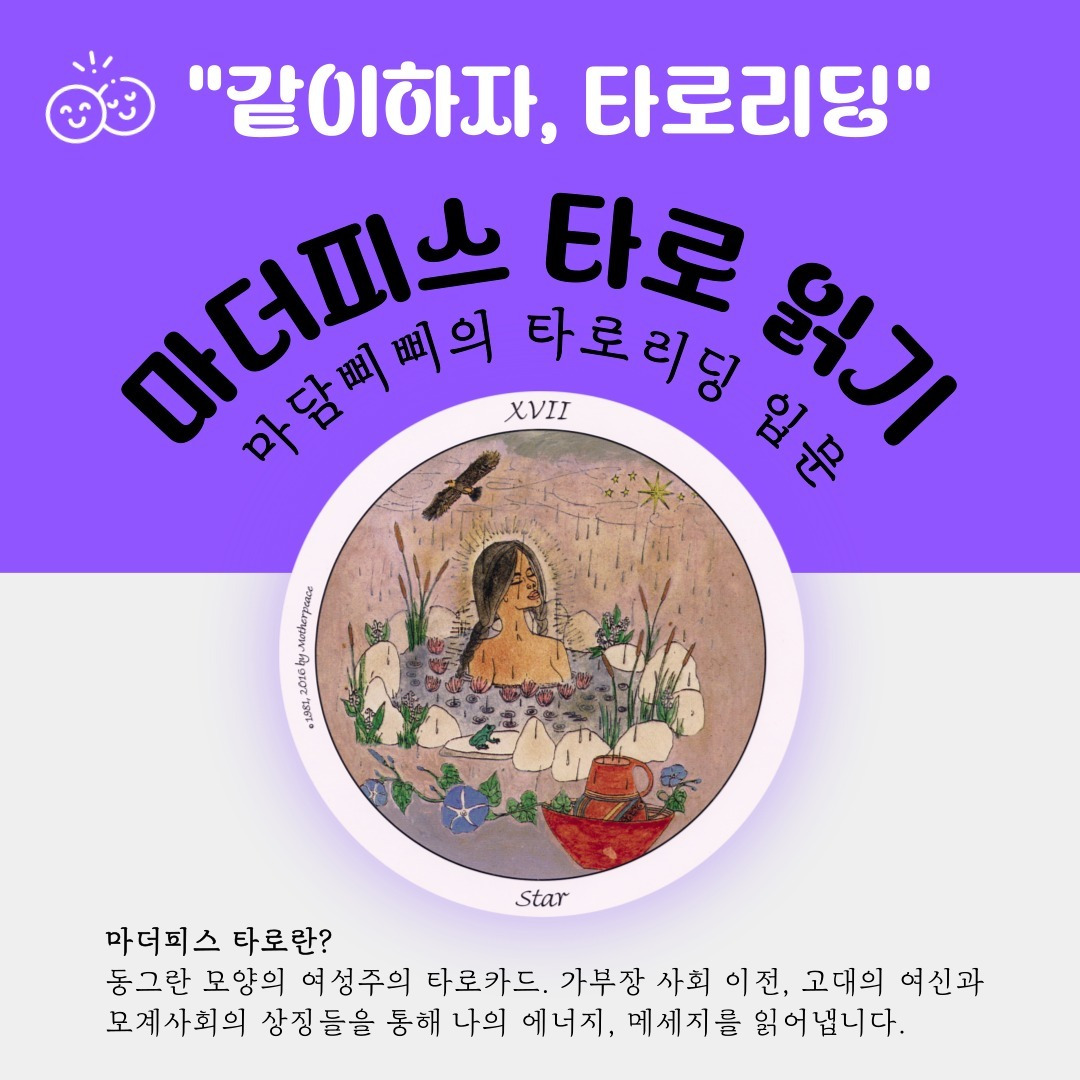 나의 부캐인 '마녀'이자 '상담'하는 사람인 마더피스 타로 읽는 사람 '마담 삐삐'가 사람들이 만나는 장을 여는 것을 해보자고 공동 기획을 해보자고 생각을 모으게 되었다. 그리고 여성의일과미래에서 구상하고 있는 시간을 견디는 서로 돌봄 같은 아카데미, 공부의 시간을 여는 시도에 참여하기로 했다.