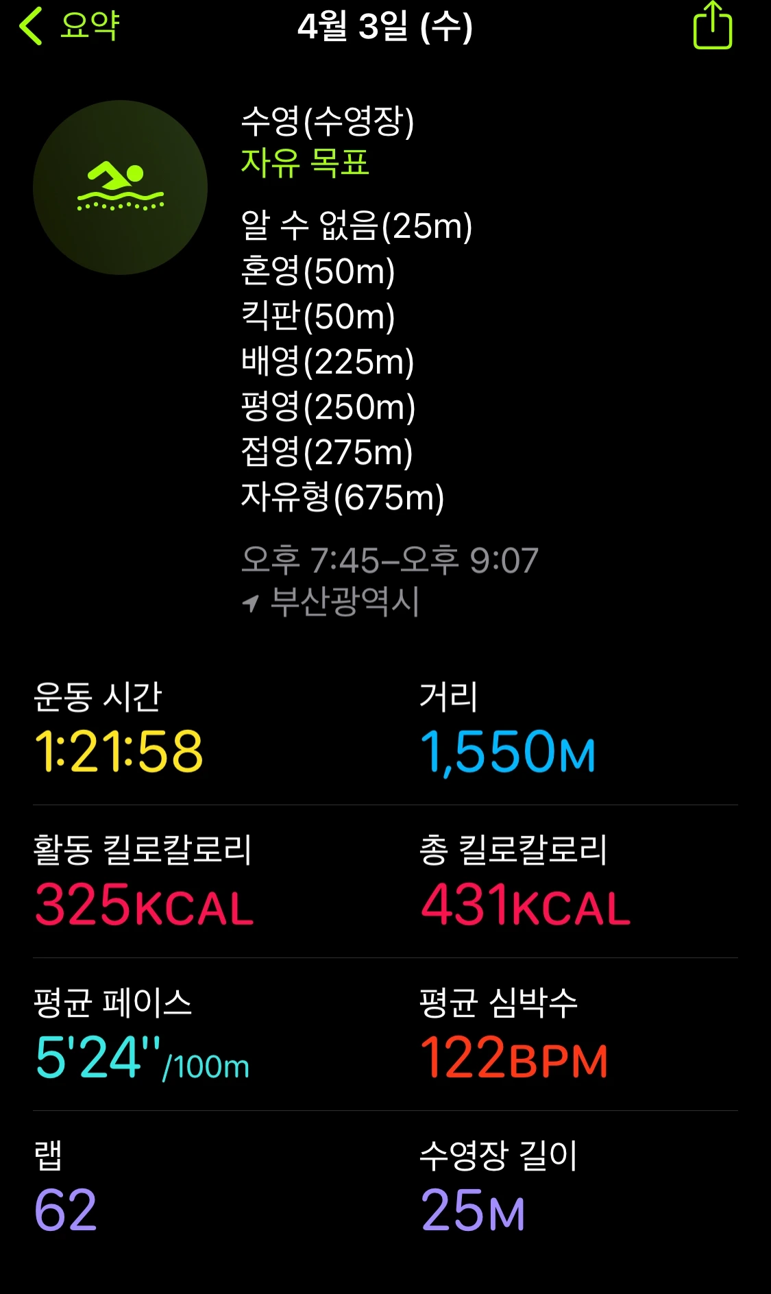 P.S : 운동 시간은 수영전 샤워, 수영, 수영 후 샤워 포함시간.