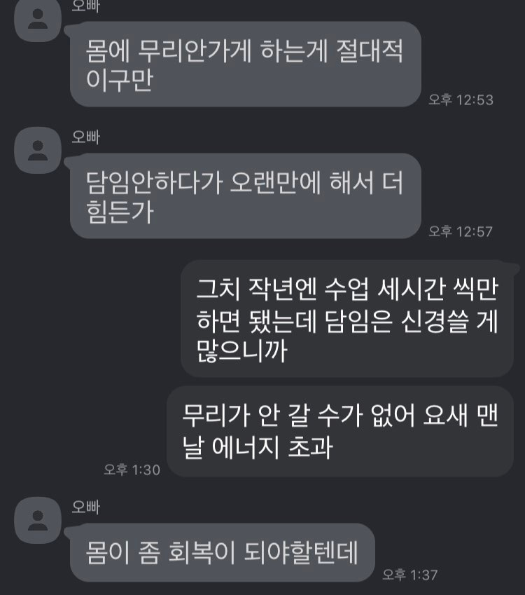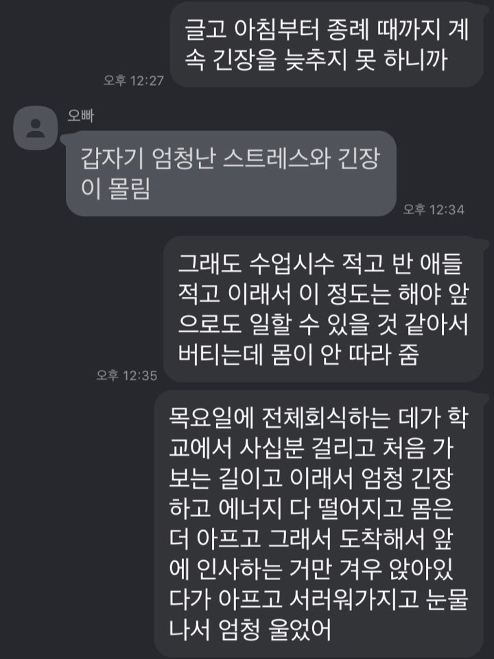 - 임쌤 아픈 것이 우선 가장 먼저 나아야 하고, 그런데 지금 학기가 시작돼서 기간제 선생님을 구하기가 매우 어려워요. 담임이 바뀐다는 게 문제가 아주 커요. 학교의 사정이라는 것도 있어요.