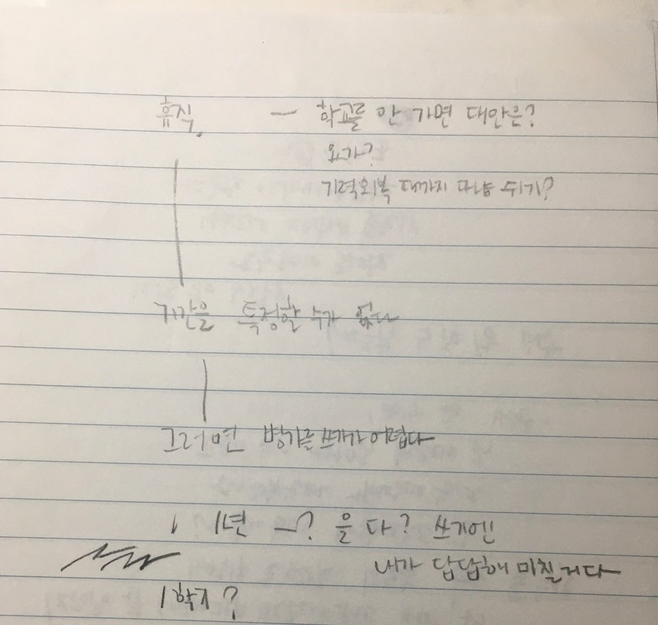 나는 휴직을 하기로 마음의 결정을 내렸다. 이미 새 학기가 시작되어버렸고, 새 학기를 위한 기간제 교사 채용은 2월 중순에 모두 마무리가 되니 그것이 얼마나 파장이 큰 결정인지 나도 잘 알고 있었다. 게다가 고등학교 2학년 담임. 고등학교, 담임, 생활기록부는 불가분의 관계다. 그것이 중간에 교체되는 일은 무엇보다 아이들을 위해 없어야 한다.