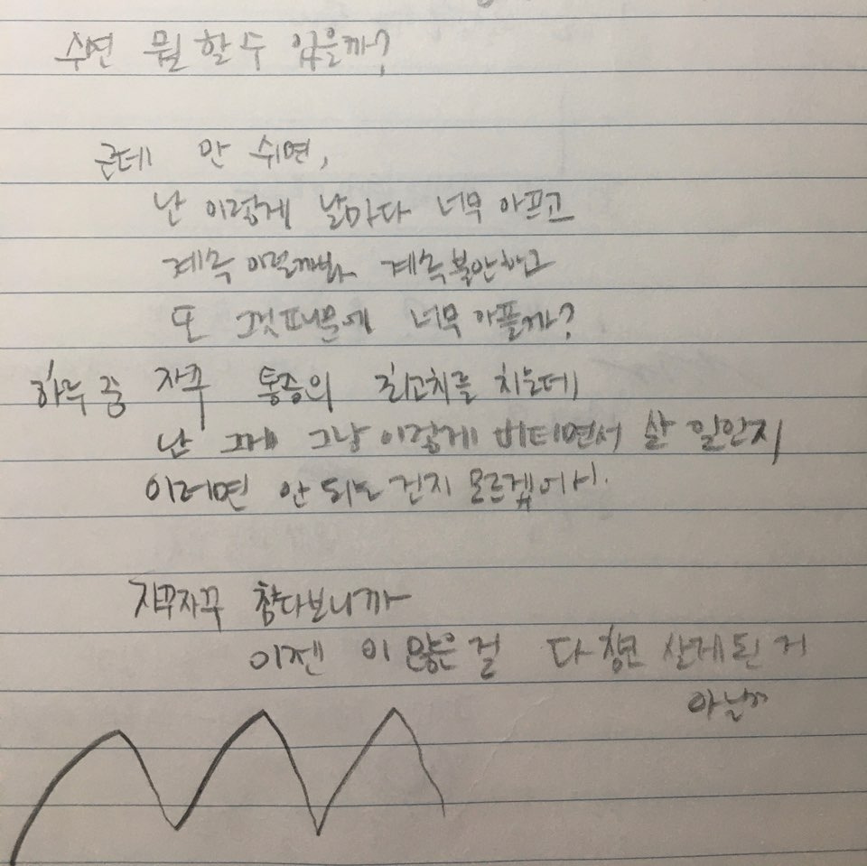 아침에 샤워를 하고 학교에 갈 준비를 하려는데 몸이 목각 같다. 이대로 굳어버리는 건 아닐까. 모든 게 너무 힘들어서 금세 지친다. 통증과 싸우는 것은 많은 에너지를 필요로 한다. 아침에 출근하며 콜드플레이의 픽스유를 들었다. 열심히 노력하는데 왜 난 나아지지 않는 걸까. 눈물이 났다.