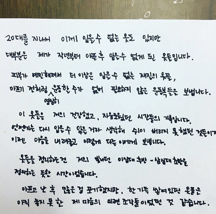 피부가 예민해져서 더 이상은 입을 수 없는 재질의 옷들, 아프기 전처럼 열심히 운동할 수가 없어 필요가 없어진 운동복들을 보냅니다.