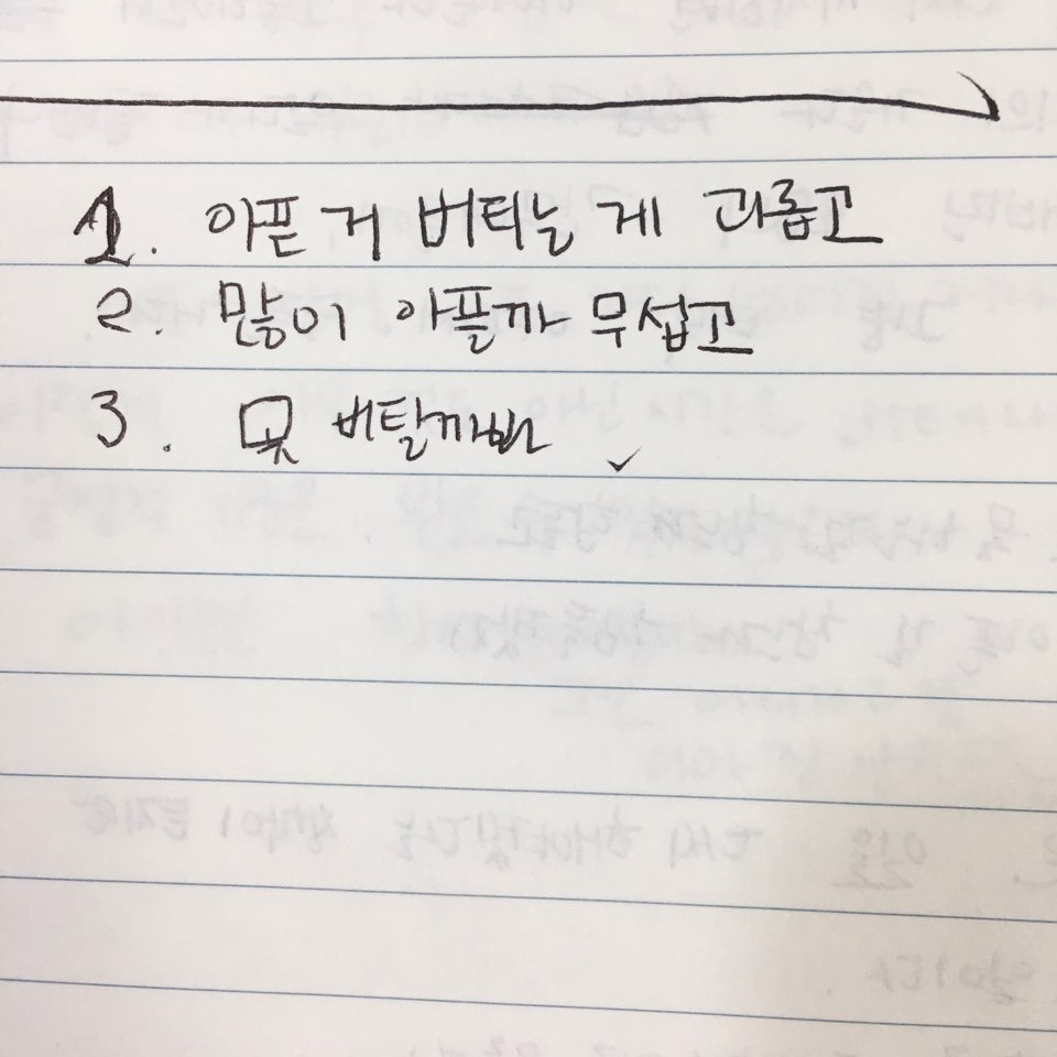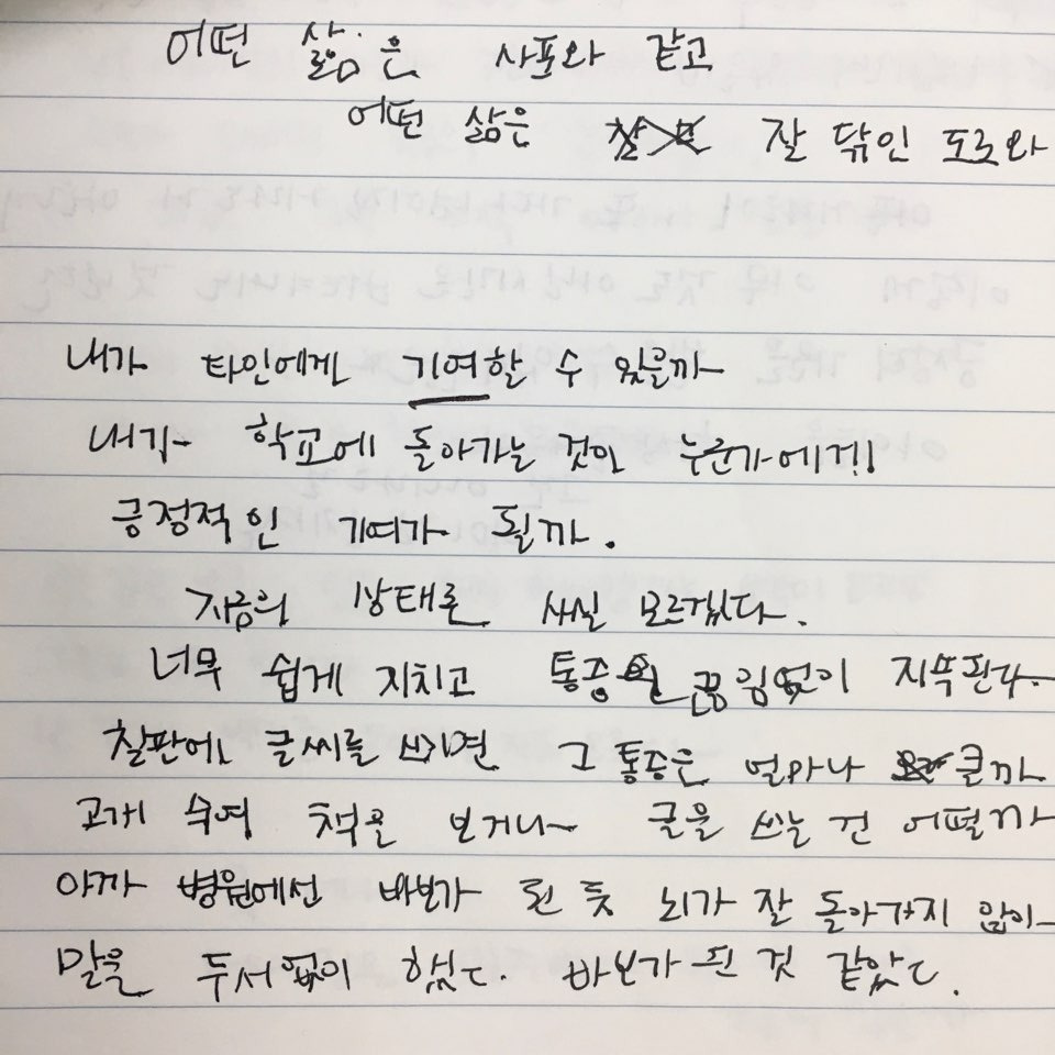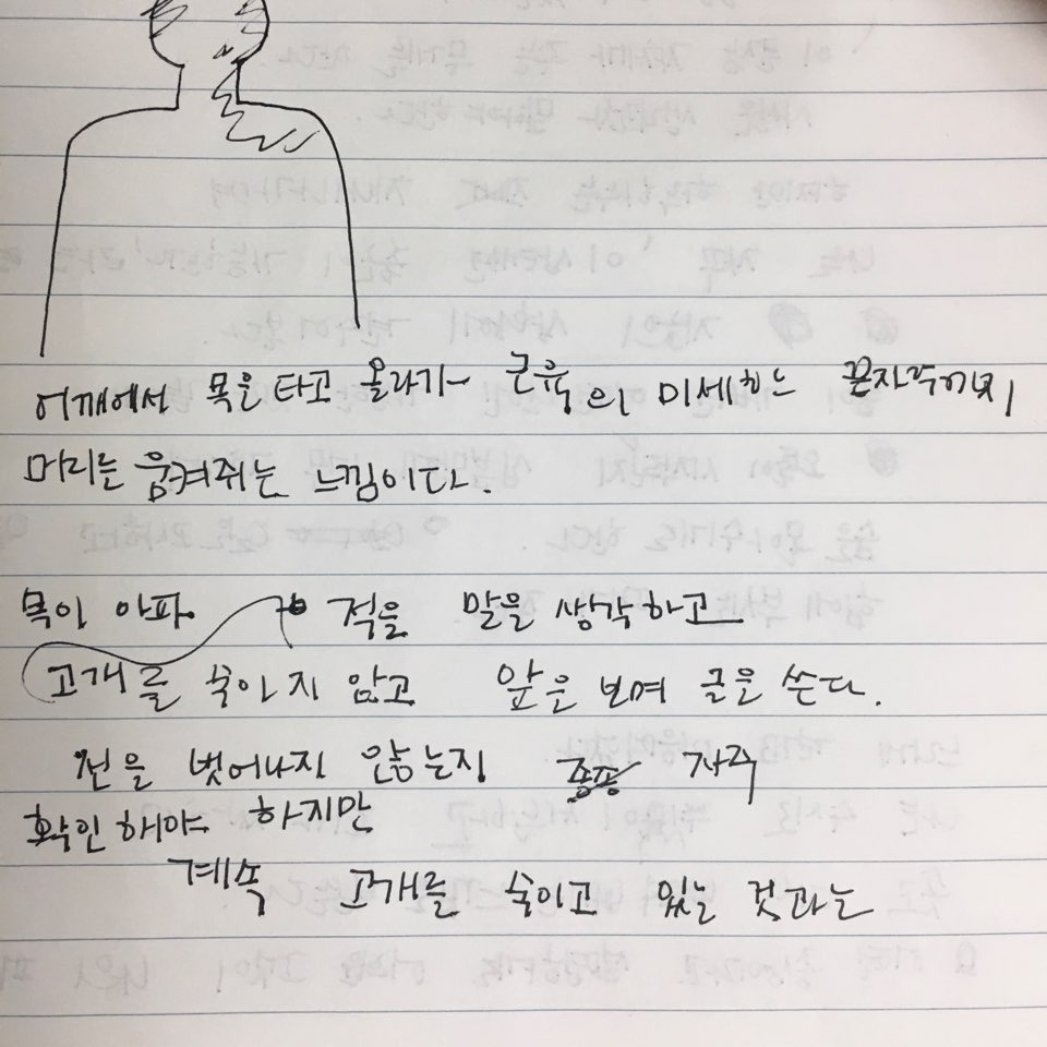 일기를 쓰는 것마저 힘들었다. 나의 주 통증 부위는 목과 어깨, 등이었는데 글씨를 쓰는 자세는 꽤 괴로웠다. 사방으로 당기는 근육의 뻣뻣함과 통증 때문에 고개를 숙이는 것조차 힘들어 그저 허공을 응시한 채 글씨를 써 내려가기도 했다. 그즈음의 일기는 글씨가 정말 엉망이었다.