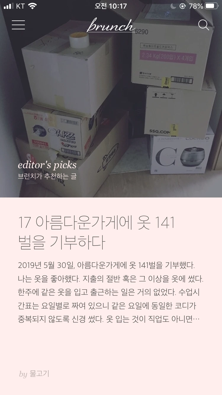 (17 아름다운가게에 옷 141벌을 기부했다 https://brunch.co.kr/@pisceswriter/22)