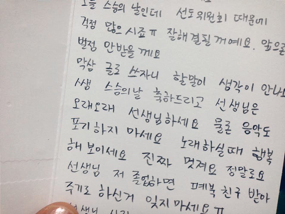 ‘쌤도 우리 예진이 많이 보고 싶은데 아직 만날 약속을 하고 지킬 수 있는 몸 상태가 아니야. 빠르면 올해 말에나 볼 수 있을까? 몸 좀 나아지면 우리 예진이 만나는 거 꼭 기억하고 있을게. 아직 집 가까이 말고 외식하러 나가는 것도 잘 못하지만 혹시나 가능해질 때 가게도 꼭 놀러 갈게. 마음은 엄청 보고 싶어. 몸이 안 따라줄 뿐이야. 예진아, 오늘 하루도 힘내고 좋은 일만 가득하길 바랄게. 쌤은 뿌듯하고 든든해.’