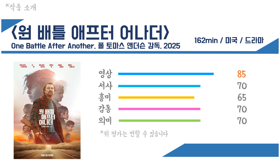 평단의 찬사가 쏟아지고 있는 <원 배틀 애프터 어나더>(2025)를 뒤늦게 관람했다. 일단 다른 건 몰라도 러닝 타임이 3시간 가량 되면 덜컥 겁부터 난다. 이런 종류의 영화는 할 말이 너무 많아서 기억하기 버겁거나, 그조차도 아니어서 마냥 지겹기만 할 수도 있다. 다행히 세 시간이 지루하다고 느껴지지는 않았고 장단점이 분명한 영화처럼 보였다.