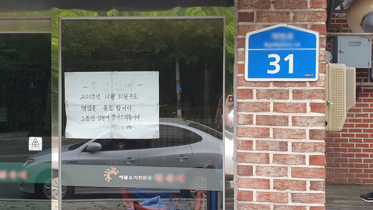울산 중구 학성동 인근의 한 식당이 폐업 공지문을 붙여놓았다. 코로나19가 한창 창궐하기 직전인 12월 31일 자가 눈에 띈다. *사진 : 울산 중구 학성동 인근