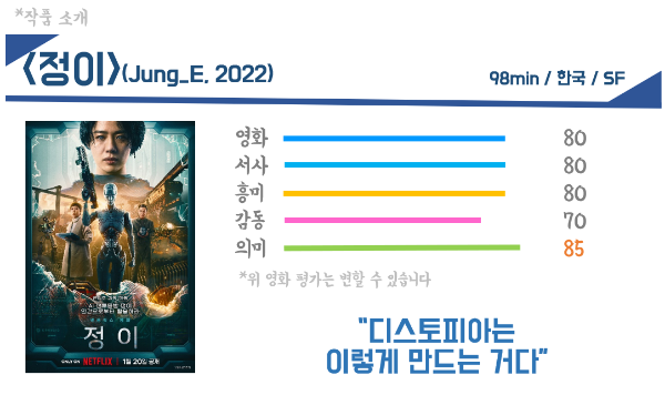 로봇이라는 외피를 썼지만 그 속은 인간이듯이, AI와 로봇, 디스토피아적 미래라는 틀을 썼지만 결국 인간의 이야기를 다룬다는 점에서 <정이>는 기존의 장르를 뛰어넘는, 획기적인 작품이 될 것이 분명하다.