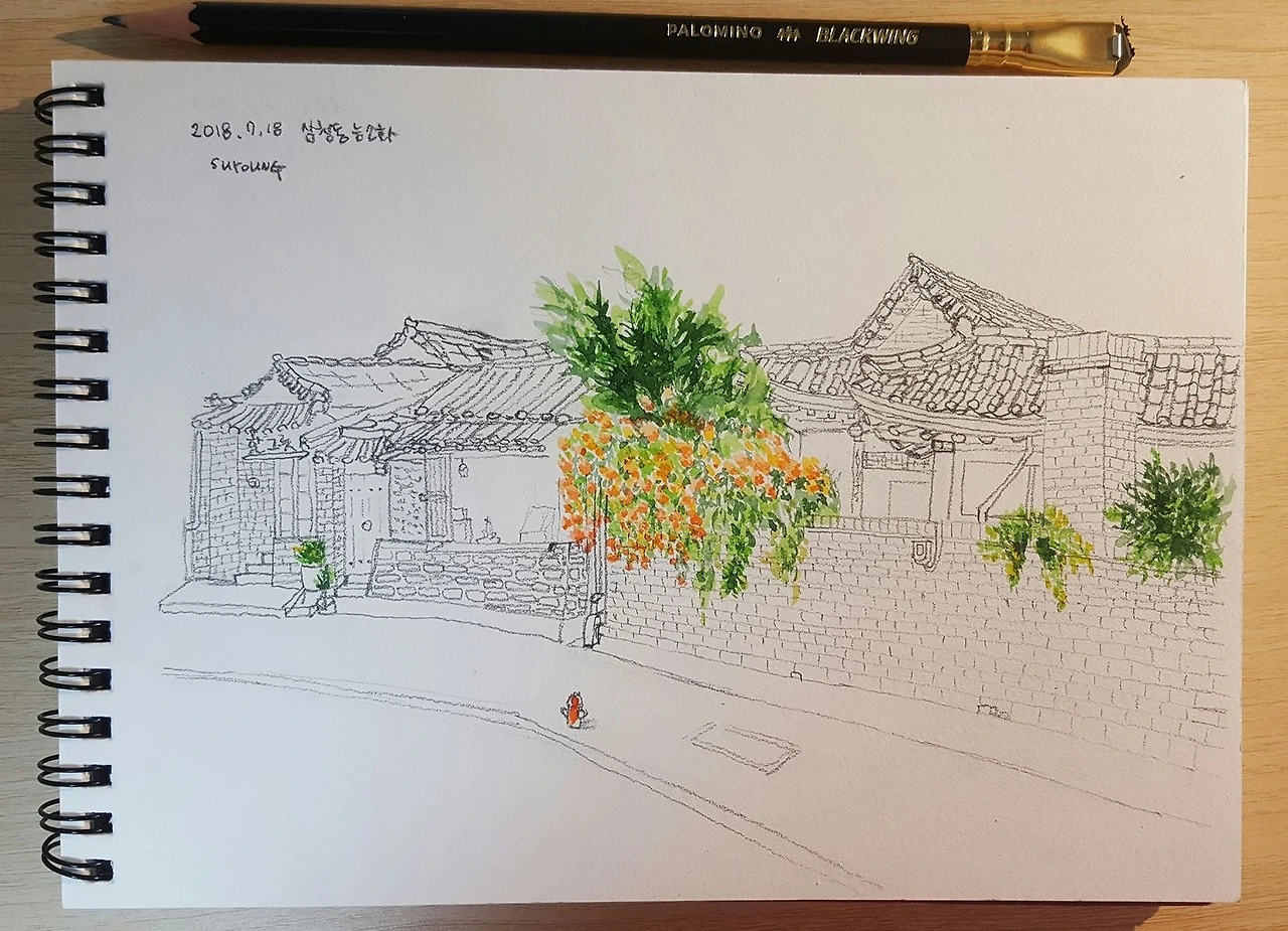 공항에서 대기시간 동안 그분이 그림 그리실 때 저도 옆에서 주섬주섬 도구들 꺼내서 그분이 가르쳐 주시는대로 해보고. 그림을 그리는데 방법이 있는 게 아니라 뚫어지게 보고 자세히 보고 따라 그리면 되는 것 같더라고요. 다 뚫어져라 쳐다보고 그린 거예요.