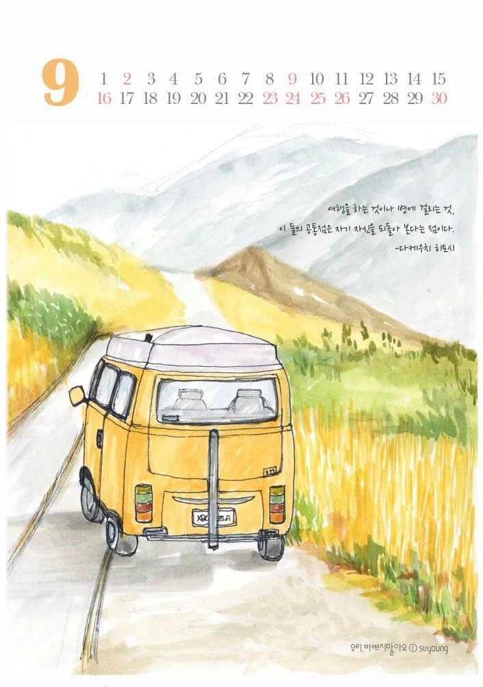 하다 보니 무슨 생각이 들었냐면 그리는 건 좋은데 나만의 작은 목표가 있으면 좋겠다는 생각이 들었어요. 내가 그린 그림을 모아서 내년 달력을 만들자. 그럼 무슨 그림으로 채워 넣을까 하면서 잡은 주제가 ‘우리 바쁘지 말아요’.