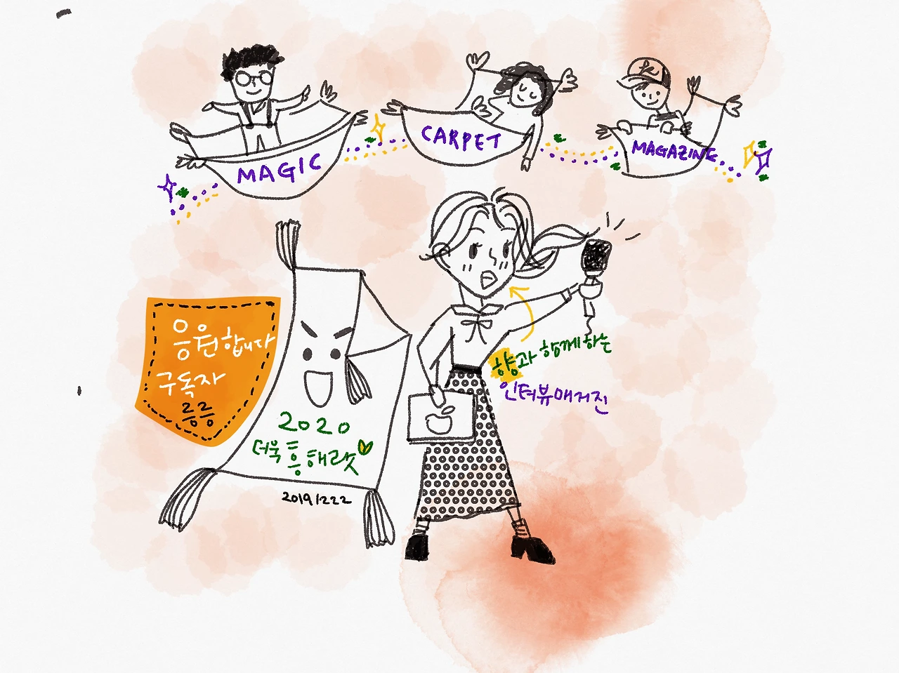 매직카펫 매거진의 2019년은 10명의 인터뷰와 3개의 레터로 요약됩니다. 7월 24일 첫 글을 발행했으니 한 달에 두 번 정도 업로드한 셈이에요. 인터뷰 시간을 따져보니 대략 780분, 인당 평균 78분씩 저와 인터뷰를 했고요.(인터뷰 전 식사 시간제외) 인스타그램과 페이스북 계정을 운영하면서 사진과 영상을 편집해보기도 하고 매력적인 인용문을 뽑느라 고민하기도 했어요.