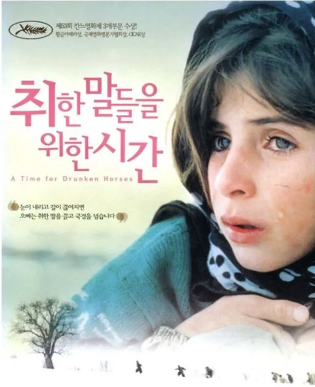 단내가 날 정도로 고단하게 품을 팔러 다니는 쿠르드족 아이들이 부르는 노래다. 이라크와 이란을 사이에 둔 국경 마을에서 이들이 할 수 있는 거라 곤 밀수품을 중개해주고 수고비를 받는 일이다. (참고로 쿠르드족은 터키, 시리아, 이란, 이라크에 걸쳐서 살고 있는 산악 민족이다. 인구는 대략 3,300만이다) <취한 말들을 위한 시간>은 국경을 가로지르는 흰 눈에 덮인 산을 넘어갈 때마다 말들에게 술을 먹이는 장면에서 따온 제목이다. 시적인 제목에 비해 영화 내용은 그렇게 낭만적이지 않다. 그날 추위의 정도에 따라 독주의 분량은 1병에서 4병까지 정해진다. 산을 넘어가기에 무거운 밀수품들은 마치 어린 노동자들을 고단하게 만드는 인생의 짐처럼 보인다. 말까지 취하게 만드는 혹한의 날씨. 게다가 주인공한텐 몇 달 밖에 못사는 동생이 있다. 동생의 수술비를 위해 누나 ‘조진’은 이라크로 시집가게 되고 주인공 하웁은 수술비 마련을 위해 노새를 끌고 국경선을 넘어야 한다. 하지만 간단치 않은 게 매복하고 있는 국경 수비대가 그들을 치려고 한다. 그들의 조건 자체가 열악한데도 더 곡진한 묘사를 위해서 그들을 궁지로 몰아붙이는 감독의 의도가 보이긴 하지만 이 영화에 나오는 100% 자연산 아이들은 영화 그 자체이다. 헐리우드 식의 달콤한 감미료도 필요 없고 유럽의 난해한 접근도 필요 없는 테크닉이 따로 필요 없는 쿠르족 아이들의 삶 자체가 영화이다.