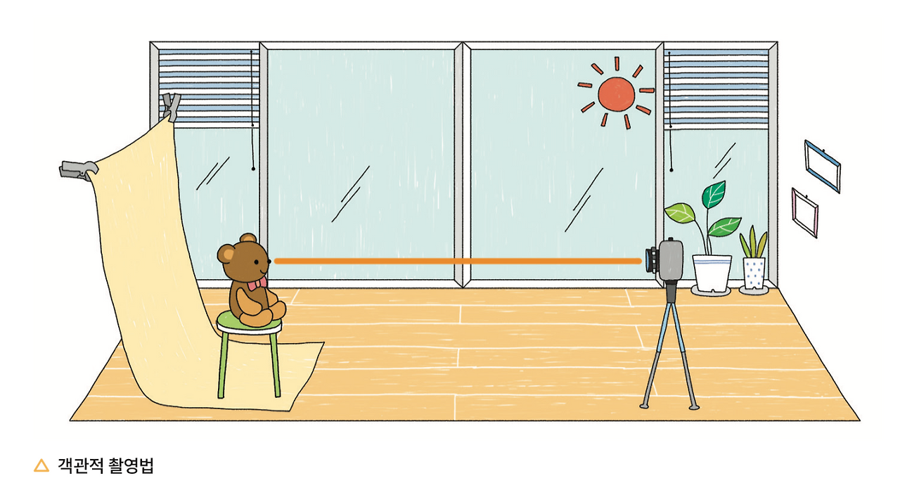 '객관적 촬영법'이라고 이름을 붙였습니다. 그리고 그림처럼 삼각대에 카메라를 올려놓고 촬영자가 개입하지 못하도록 합니다. 카메라의 특별한 앵글 각도는 없습니다. 렌즈의 화각도 고정입니다. 곰돌이 인형을 담기에 적당한 눈높이에서 배경지를 벗어나지 않을 정도의 화각으로 맞추어져 있을 뿐입니다. 이제 촬영자가 할 수 있는 것은 무엇일까요? 심지어 카메라는 풀오토(완전 자동) 모드로 설정해 두어서 촬영자가 할 수 있는 것은 아무것도 없습니다. 초점도 알아서 맞추어줍니다. 적절한 밝기의 노출도 알아서 잘 담아줍니다. 당신이 촬영자라면 이제 무엇을 하시겠습니가? 멀리서도 셔터를 누를 수 있도록 리모컨은 드리겠습니다. 오직 당신이 할 수 있는 건 리모컨 버튼을 누르는 것 이외엔 딱히 할 수 있는 것이 없어 보입니다. 곰돌이를 촬영하기 위해 당신은 무엇을 하시겠습니까?