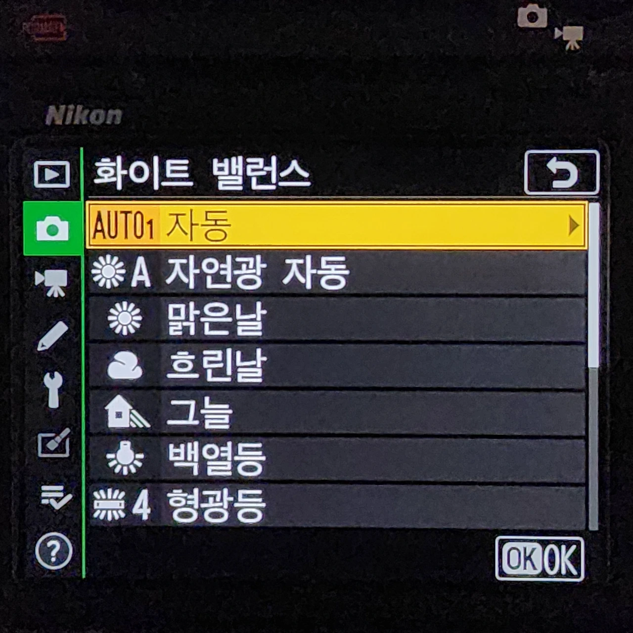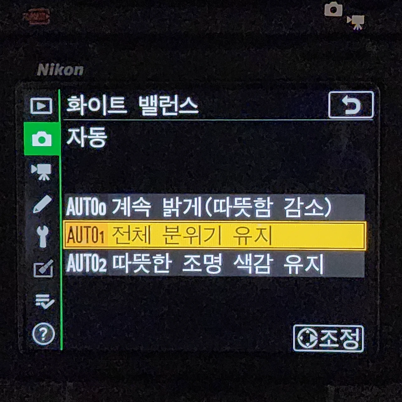 카메라모양 아이콘에서 [화이트밸런스] 항목을 찾으세요. 카메라 기종마다 조금 다른 세부 옵션을 제공할 거예요. 자동(AUTO)을 선택해 주세요~ 니콘 카메라는 자동 중에서도 추가옵션을 제공하고 있는데요. [전체 분위기 유지]를 선택했습니다. *화이트밸런스에 대한 좀 더 자세한 설명은 <후보정> 편에서 좀 더 다루겠습니다.