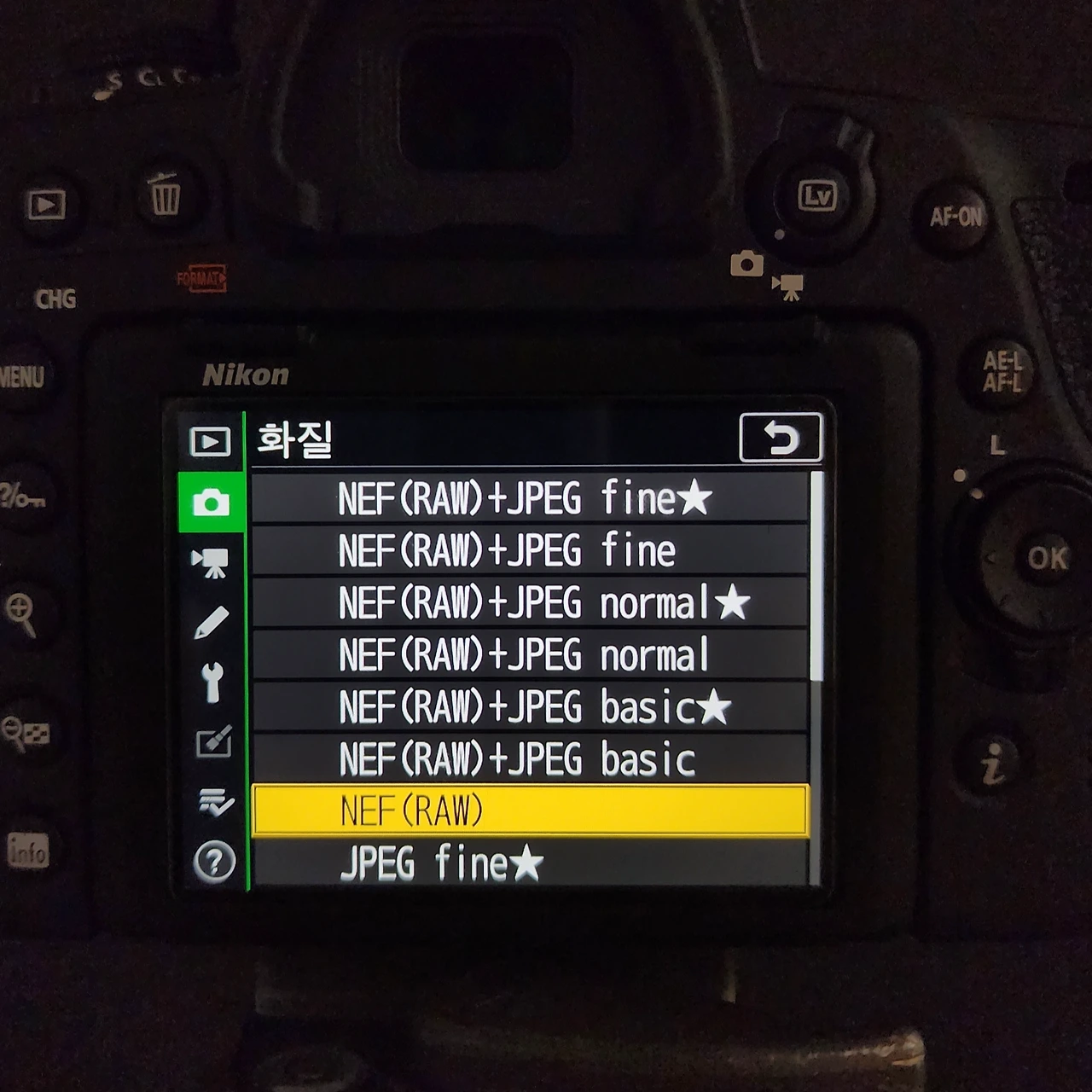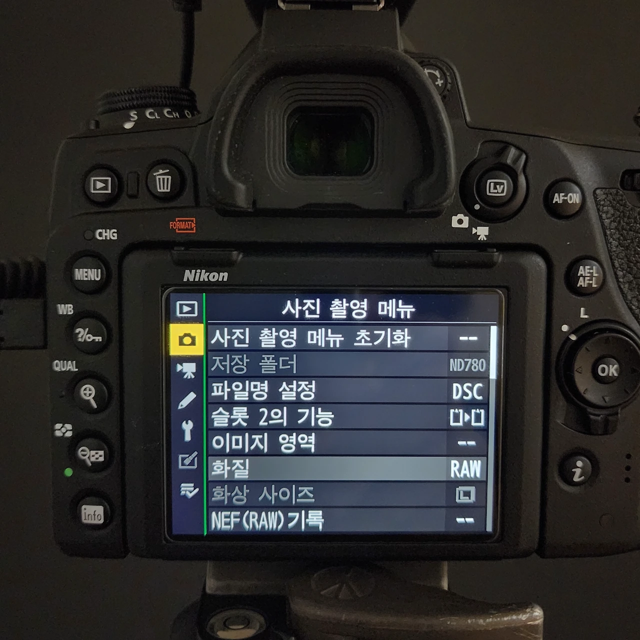1. 카메라 메뉴 > 카메라모양 아이콘 > 화질 > RAW