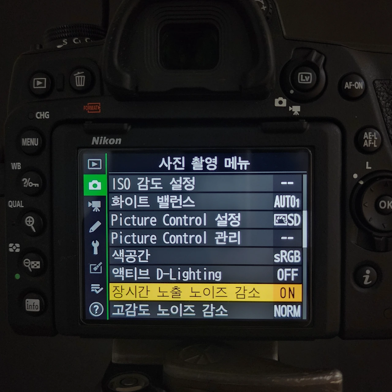 2. 카메라 메뉴 > 카메라모양 아이콘 > 장시간 노출 노이즈 감소 > ON