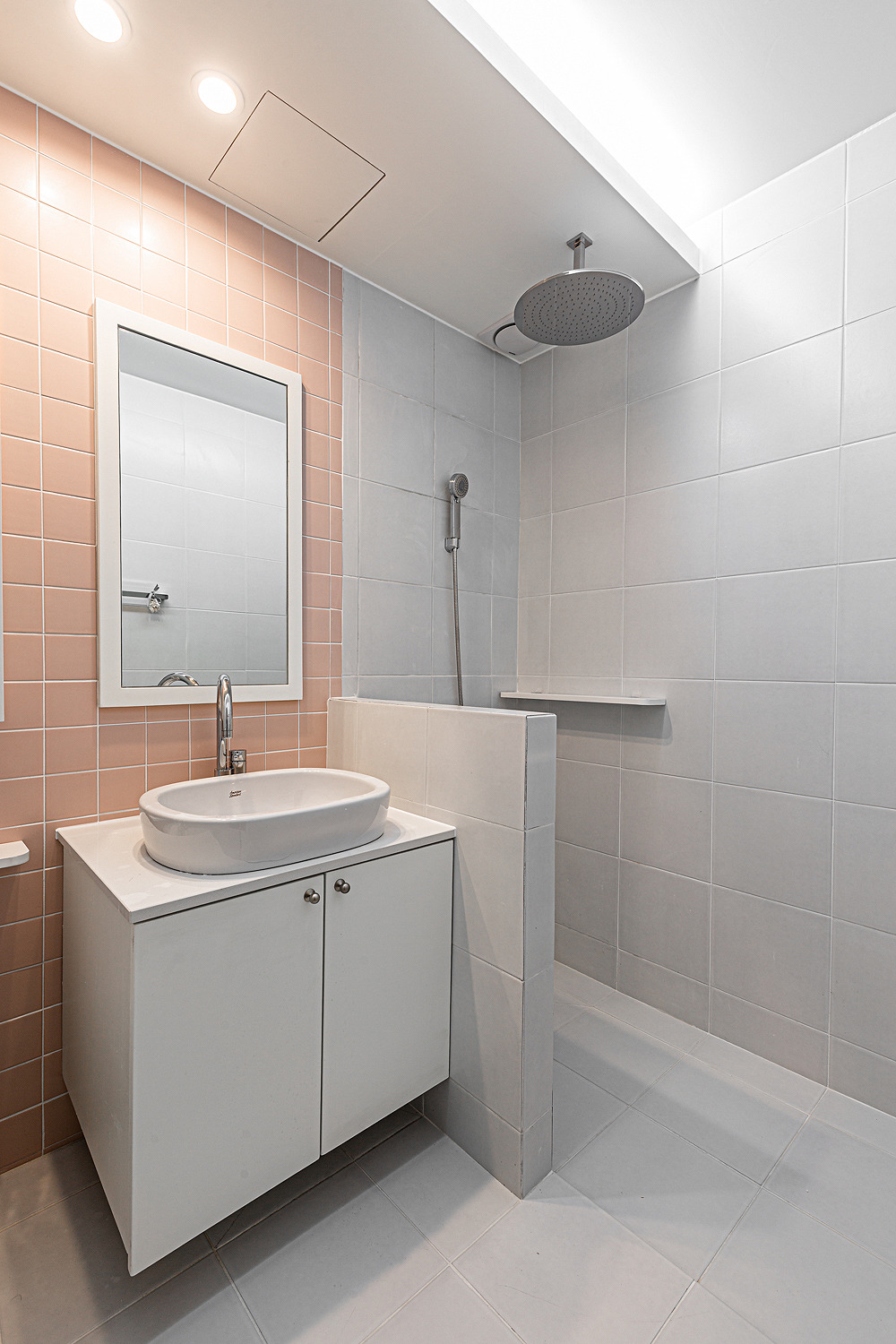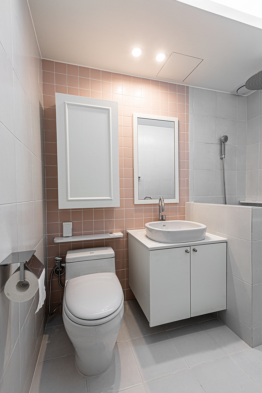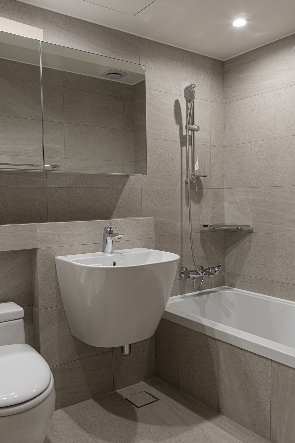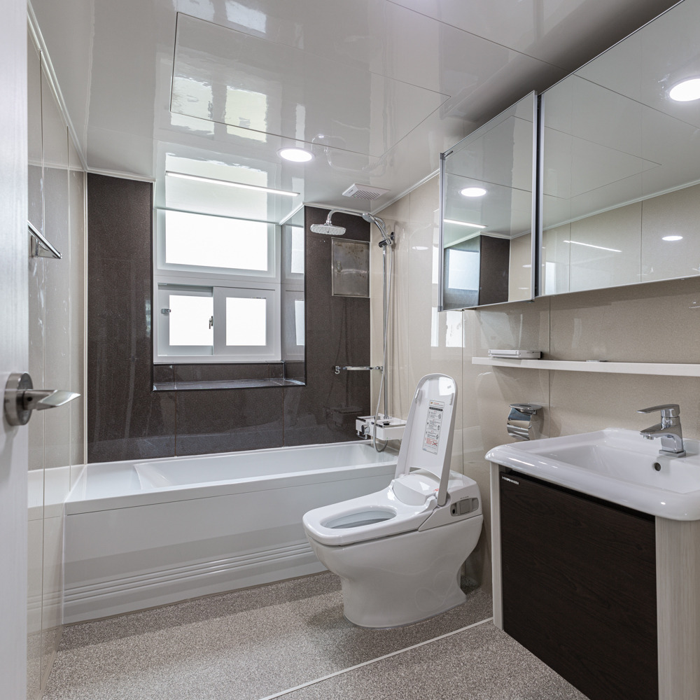 아래는 24mm 초점거리로 촬영한 화장실 컷이며, 역시 기본적인 왜곡 보정은 완료한 이미지입니다. 풀 프레임 센서를 기준으로 50mm보다 낮은 숫자의 광각렌즈는 왜곡이 있을 수밖에 없습니다. 또한 둥근 렌즈로 촬영되는 이미지인 만큼 주변부의 왜곡 또한 발생하게 됩니다. 24mm로 촬영된 사진을 기본 왜곡 보정하고 나면 우리 눈이 감당할 수 있는 수준의 적정 왜곡 정도로 편안하게 보이는 장점이 있습니다. 사진으로 본 것과 실 공간에서 눈으로 확인했을 때의 이질감도 적은 편입니다.