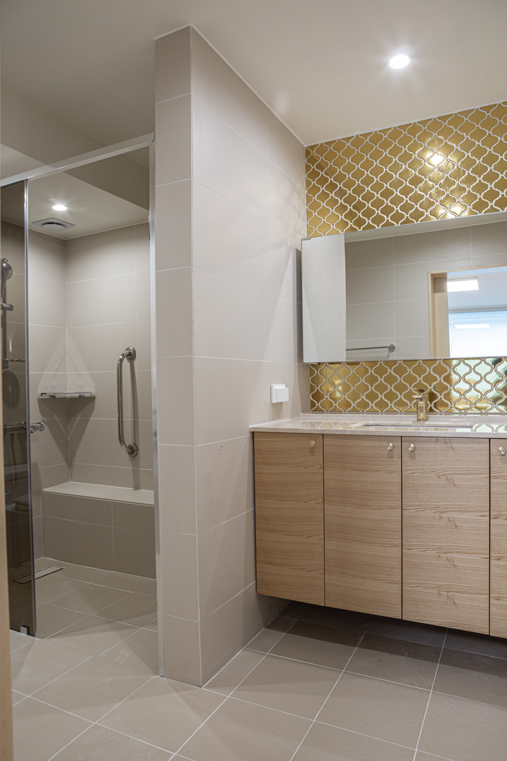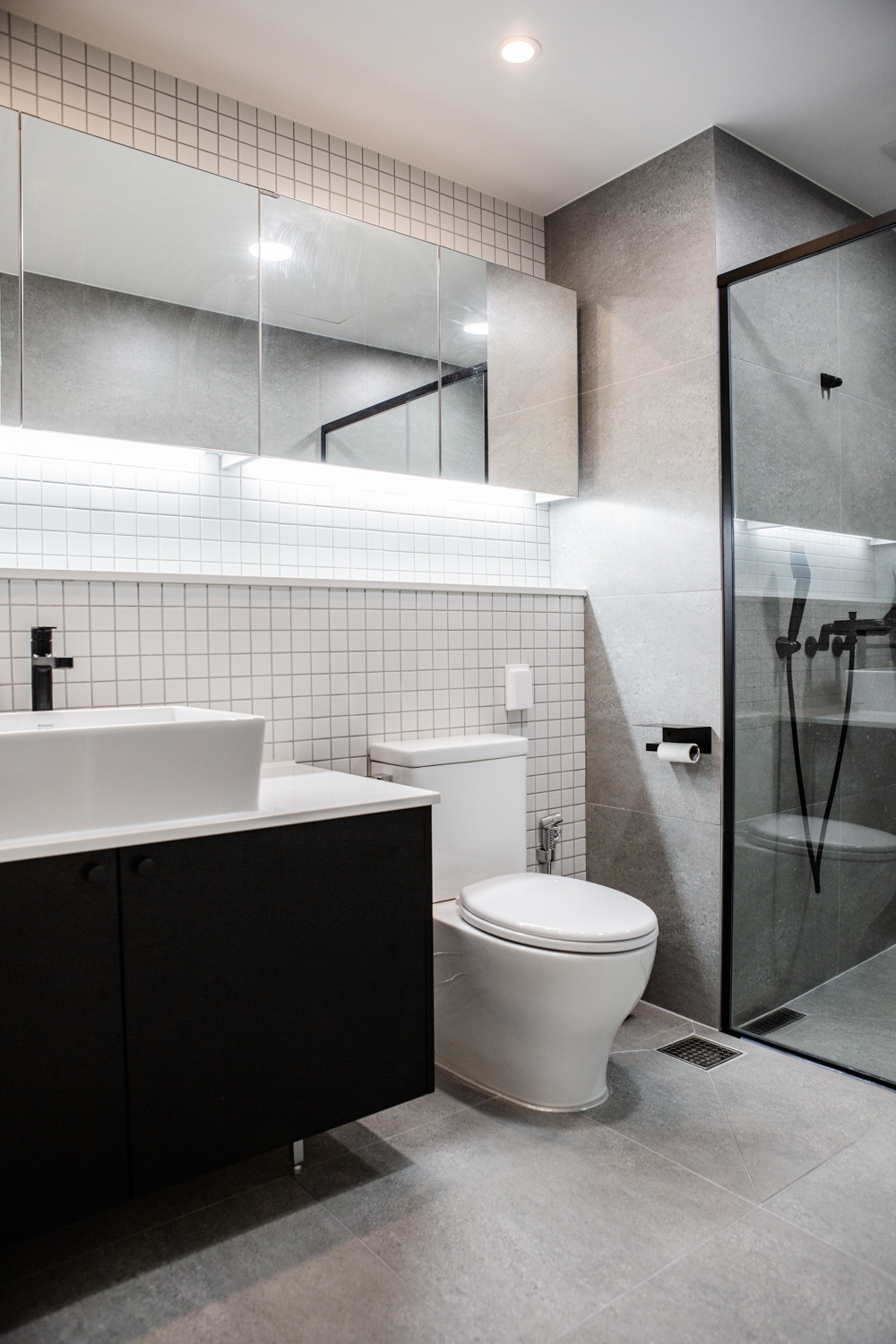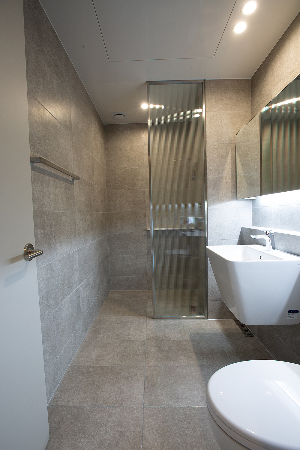 아래는 24mm 초점거리로 촬영한 화장실 컷이며, 역시 기본적인 왜곡 보정은 완료한 이미지입니다. 풀 프레임 센서를 기준으로 50mm보다 낮은 숫자의 광각렌즈는 왜곡이 있을 수밖에 없습니다. 또한 둥근 렌즈로 촬영되는 이미지인 만큼 주변부의 왜곡 또한 발생하게 됩니다. 24mm로 촬영된 사진을 기본 왜곡 보정하고 나면 우리 눈이 감당할 수 있는 수준의 적정 왜곡 정도로 편안하게 보이는 장점이 있습니다. 사진으로 본 것과 실 공간에서 눈으로 확인했을 때의 이질감도 적은 편입니다.