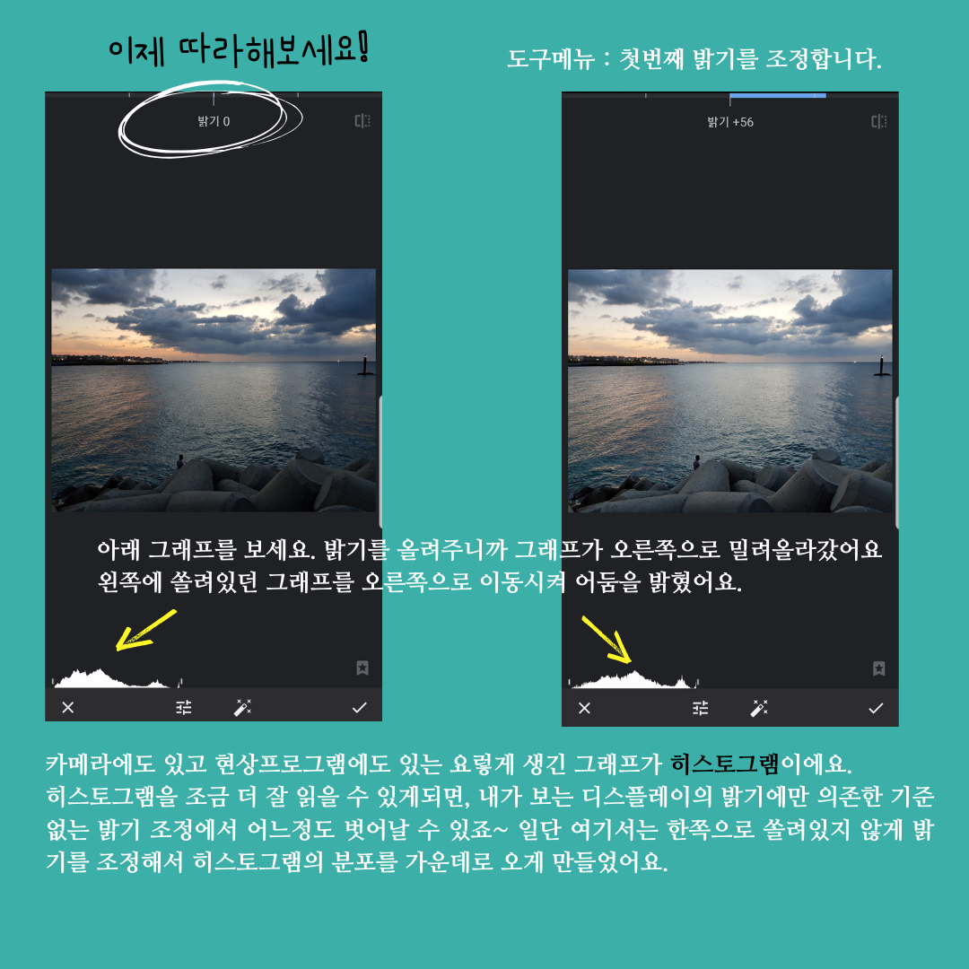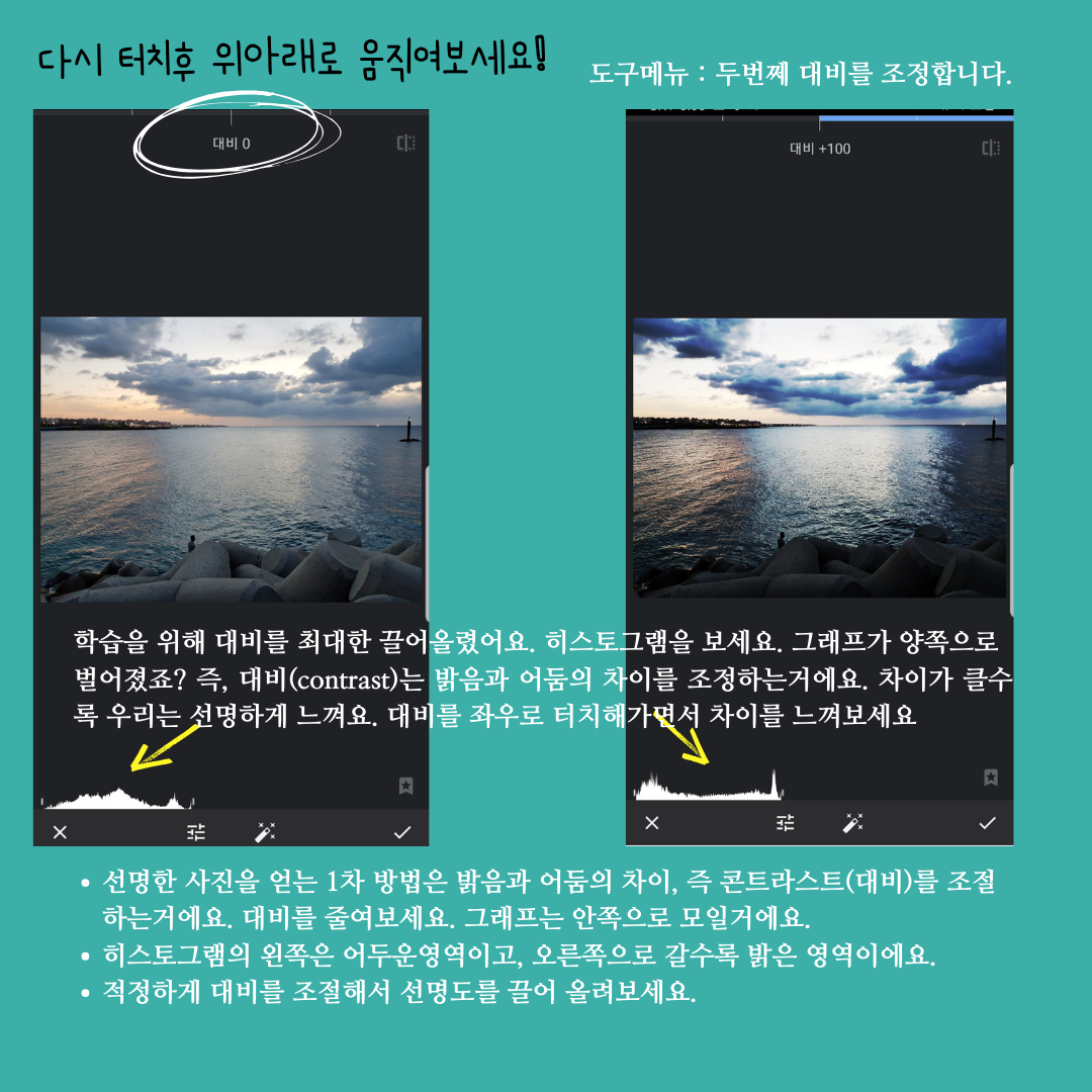 촬영한 원본 데이터는 조금 흐려요. 밝음과 어둠의 대비를 끌어올려서 사진의 선명도를 조절할 수 있어요. 사진 속에 그래프로 표현된 작은 그림 보이시죠? 히스토그램이라고 하는 거예요. 양쪽 끝에 경계가 보이죠? 그래프가 경계를 벗어나지 않을 정도까지만 조정하는 게 좋아요. 대비를 오른쪽으로 움직이면 그래프가 벌어져요. 밝음과 어둠의 차이가 커지고 있음을 나타내죠. 왼쪽으로 움직이면 그래프가 모여요. 빈 공간이 생길 수 있는데요. 빈 공간 없이 꽉 차게 활용한다고 생각하면서 조절하면 선명한 사진을 만들 수 있어요.