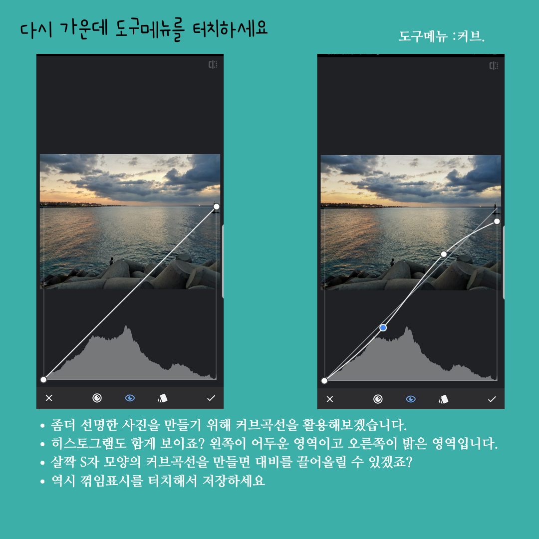 커브 곡선을 이용해서 좀 더 사진을 선명하게 만들 수 있어요. 사실 커브는 R G B 각각의 필터로 들어온 빛을 분리해서 따로 밝기를 조절할 수 있도록 만든 메뉴예요. 이렇게 활용할 필요가 있을 때가 있는데요. 여기선 분리하지 않고 통합해서 한 번에 살짝만 대비를 끌어올려서 선명한 사진에 도움 되는 정도만 활용할까 합니다.