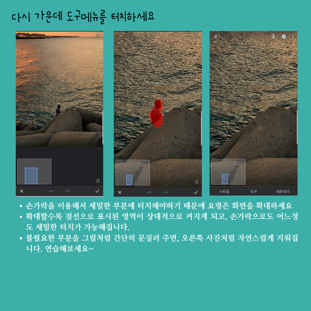 불필요한 부분을 제거할 수도 있어요. 포토샵의 힐링브러시 같은 기능이에요. 손가락으로 하면 세밀하게 하기가 힘들죠? 화면을 확대하면 좀 더 작은 영역도 손쉽게 보정할 수 있어요.