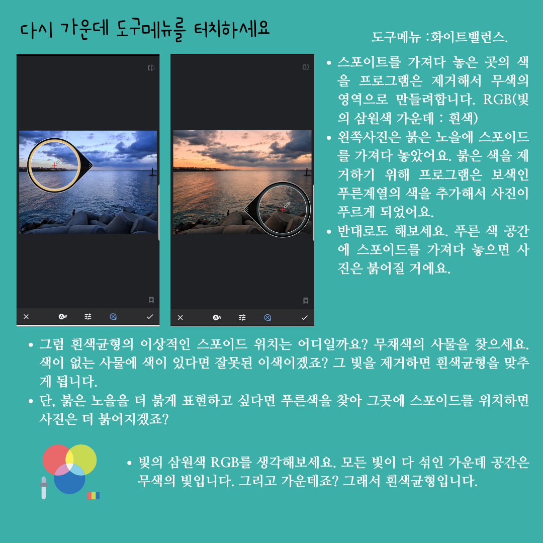 대비(콘트라스트)가 무엇인지, 화이트밸런스는 사진에서 어떻게 활용되는지를 중점으로 살펴보시면 도움 될 것 같습니다.